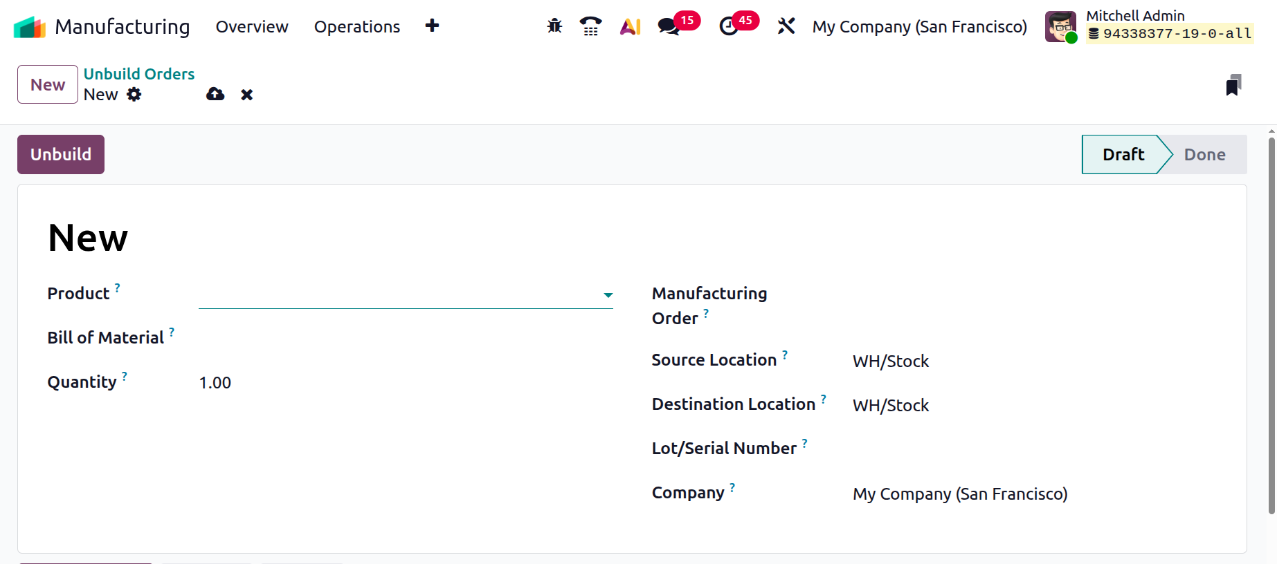 You can enter information such as the Product name, Bill of Materials, Quantity, Manufacturing Order, Lot/serial number, and Company name on the form field. The Manufacturing Order field in an unbuild order links the unbuild process to a specific completed manufacturing order whose finished product you want to dismantle back into components. Source Location is the warehouse location from which the finished product will be taken to perform the unbuild operation. Destination Location is the warehouse location where the recovered components will be returned after the unbuild process is completed.