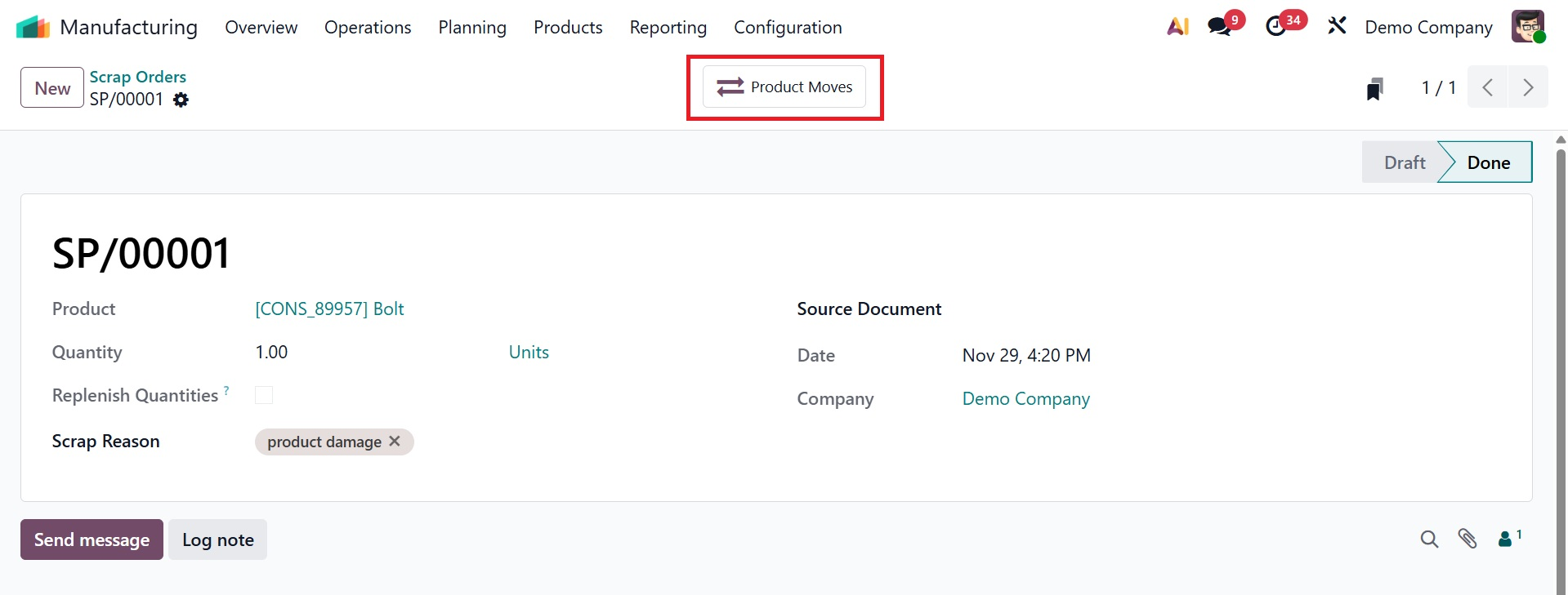 The "Product Moves" smart button allows you to view the details of the product movement history after the scrap order has been confirmed.