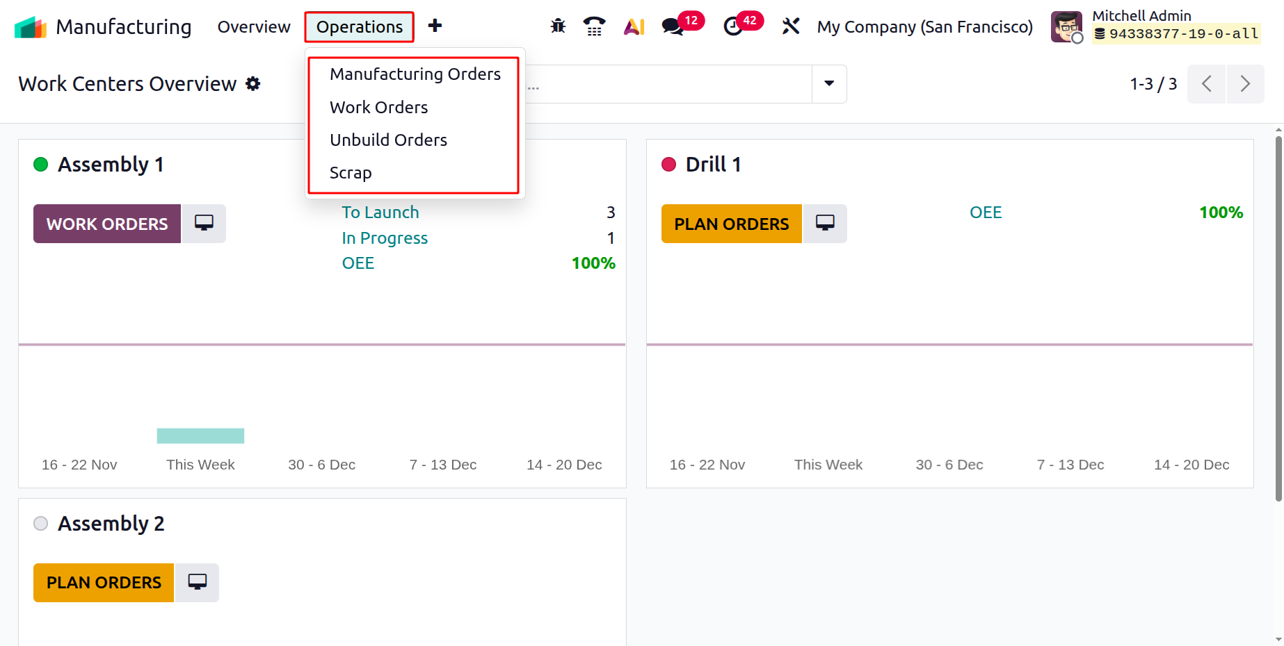 On selecting the Operations menu, you are provided with some options, like Manufacturing Orders, Work Orders, Unbuild Orders, and Scrap.