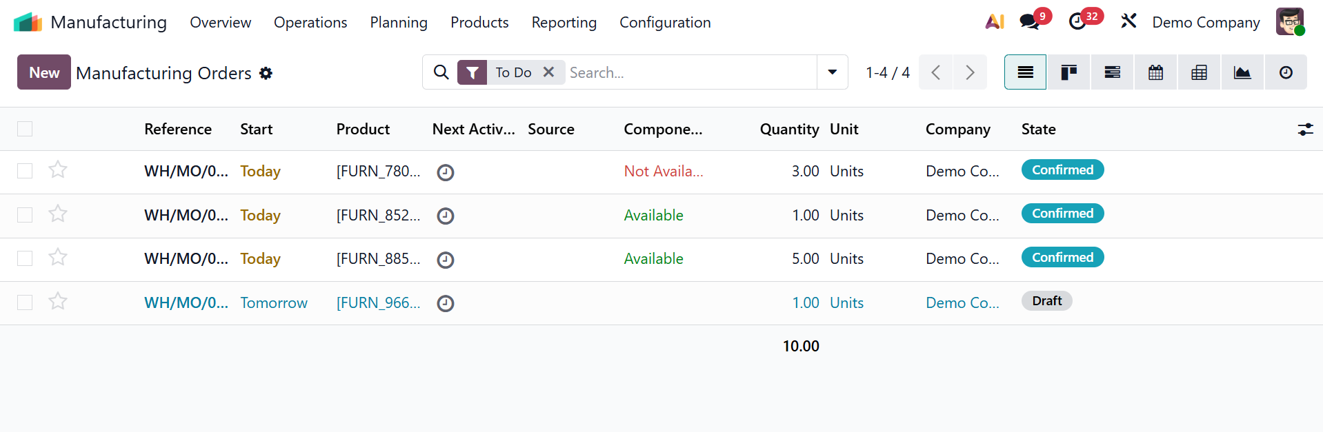 - To Do: Awaiting the commencement of production, the manufacturing order has been verified and scheduled.