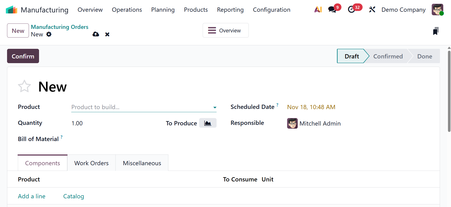 Odoo 19's creation page asks users to enter important information necessary for manufacturing operations, such as the Product Name, which describes the item to be produced, and the Bill of Materials (BoM), which lists the components and their necessary quantities. The number of units to be produced, the Scheduled date, and the Responsible User—the person in charge of the process—must all be specified in the allotted space.