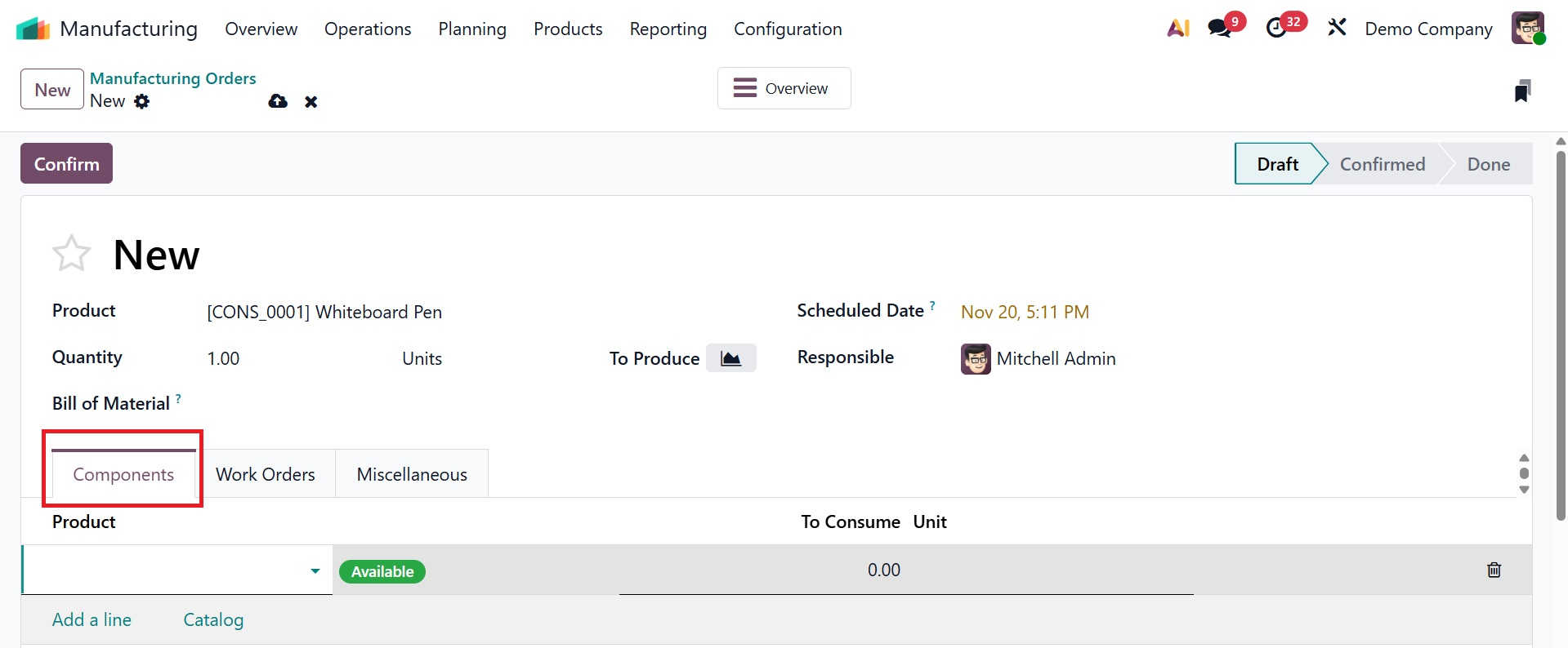 The "Add a Line" option on the Components page enables the inclusion of raw materials. As seen in the screenshot below, we can discuss the unit of measure (UoM), consumption quantities, and component products.