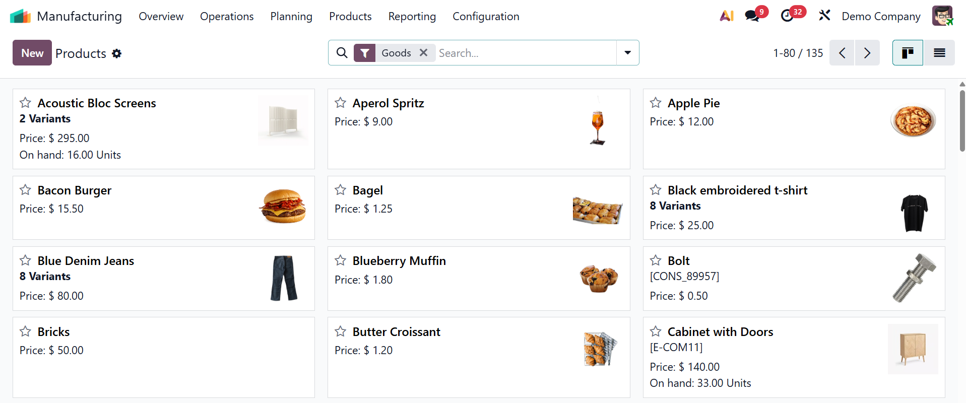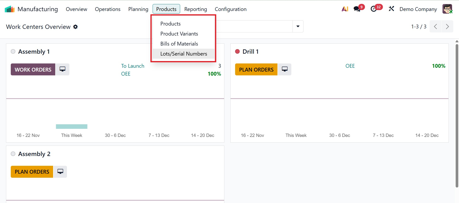 A centralized area for managing and keeping an eye on items and their variants is provided by the production module. Under the products menu, you have the options like, products, product variants, bill of materials, and lot/serial numbers.