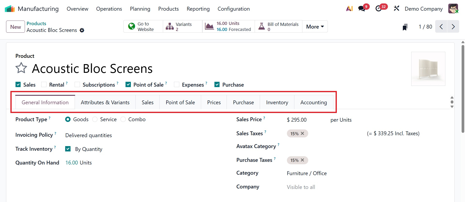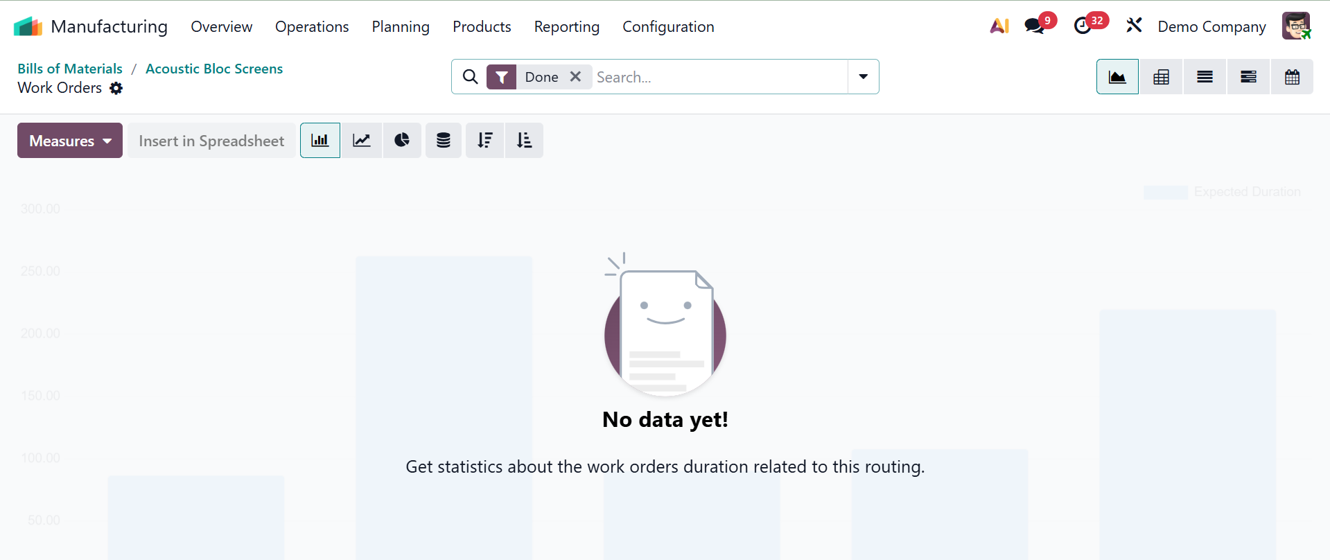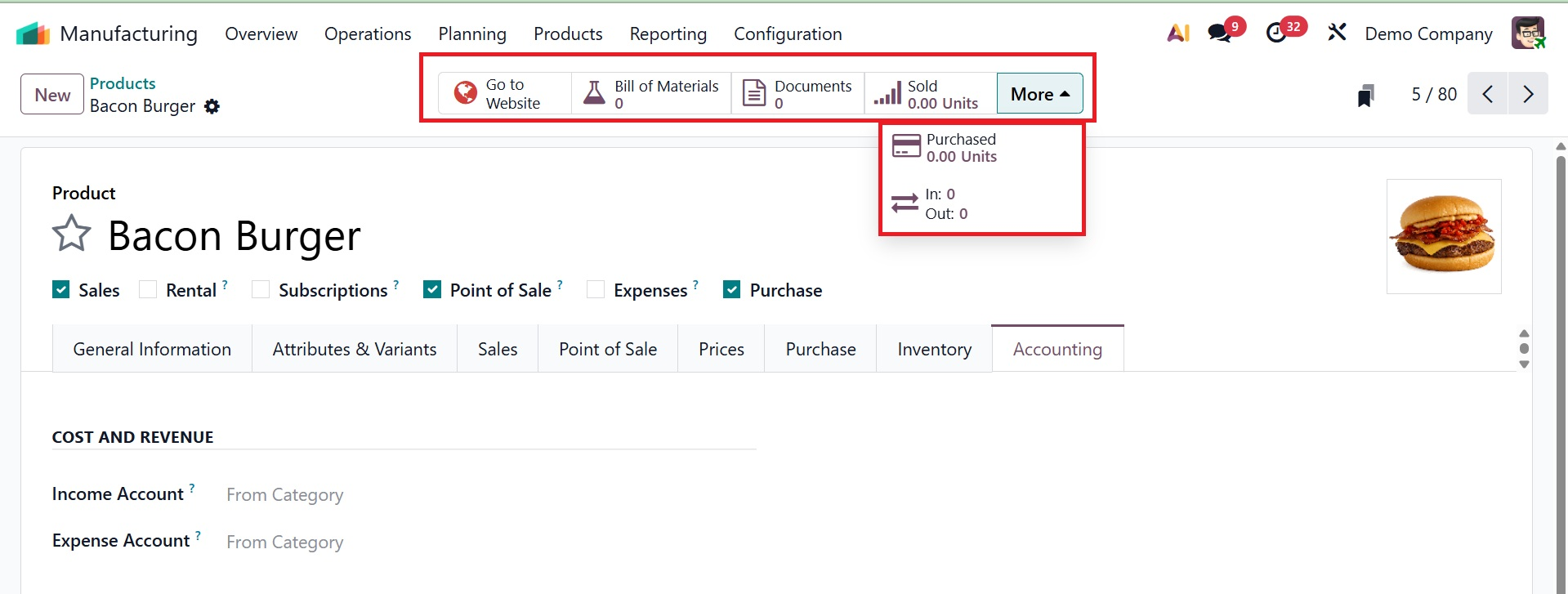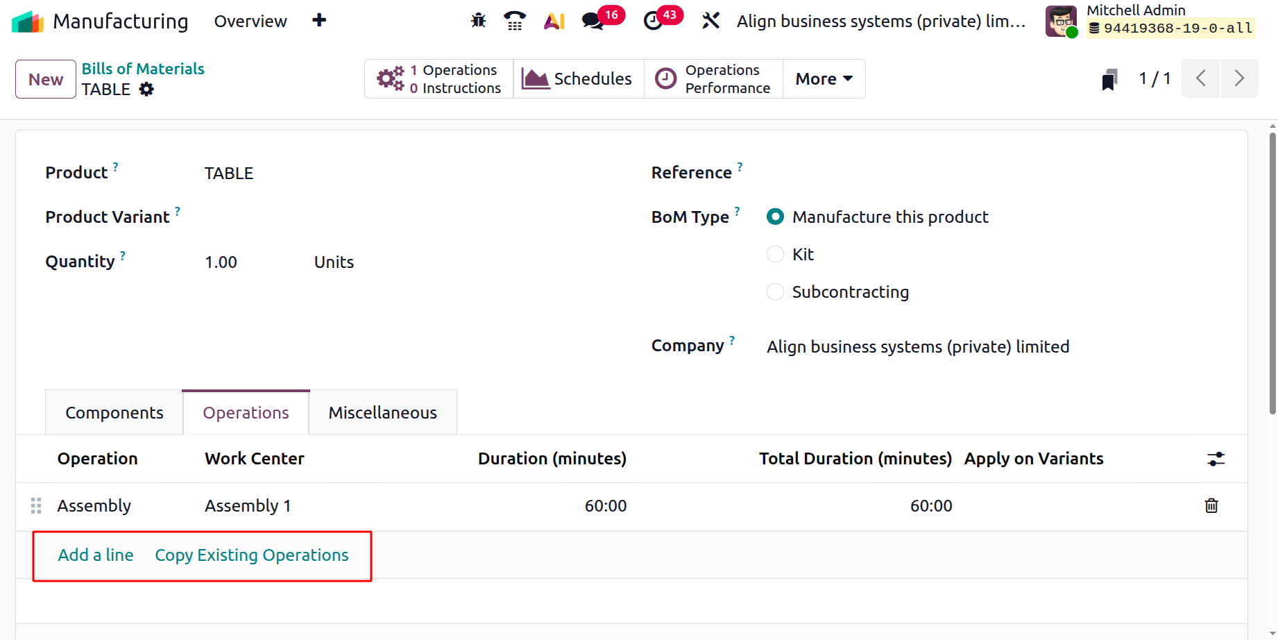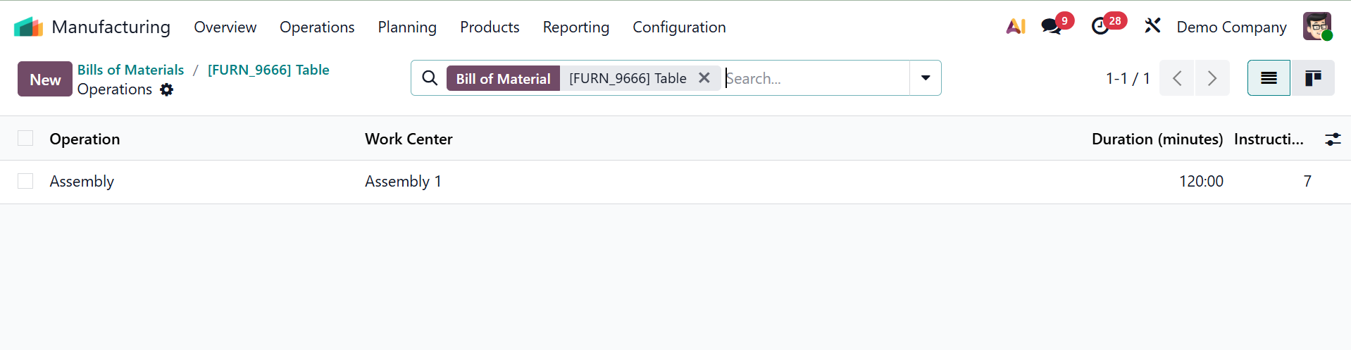 - Operations –Displays all work center operations linked to the BoM, including their steps, durations, and routing details.