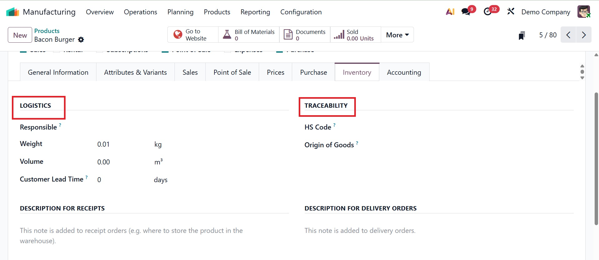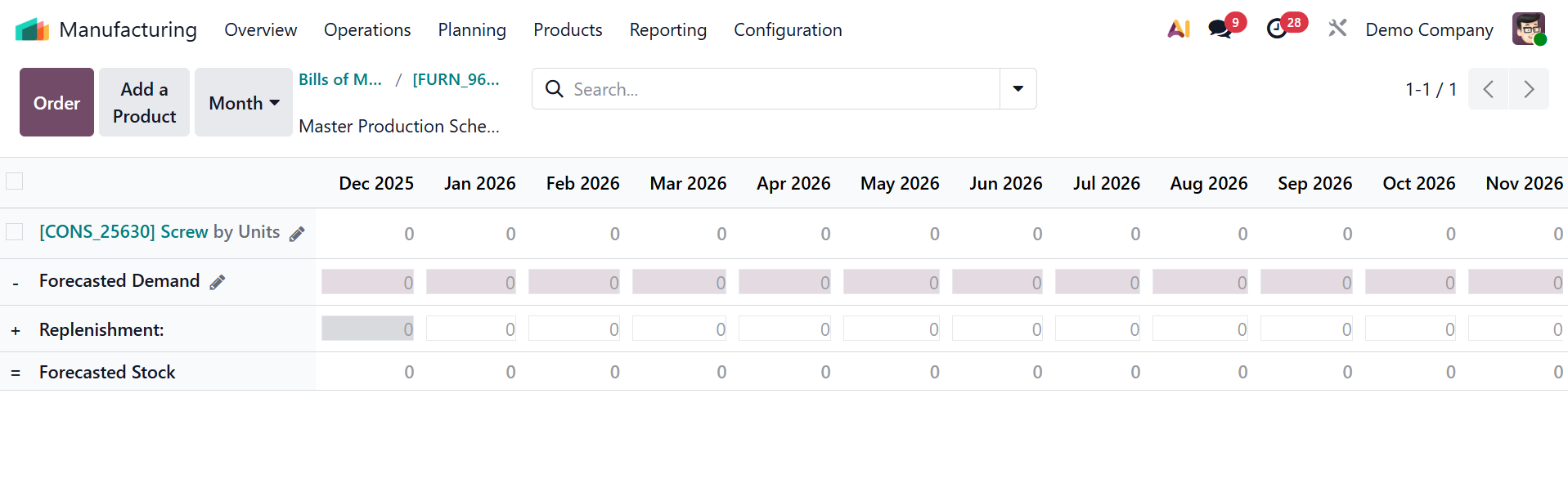 - Bill of Materials (BoM): Enumerates all bills of materials associated with the manufacturing product.