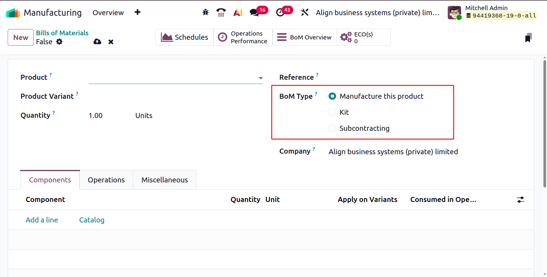 Product name, Product Variant (selected from a drop-down menu), Quantity, Reference, and BoM Type (such as Manufacturing this product, Kit, or Subcontracting) can all be entered on the BoM creation page. Then the user can also specify the name of the Company.