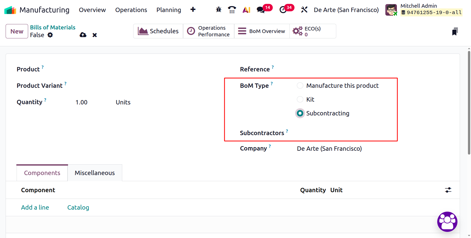 - 3. Subcontracting: to oversee the outsourcing of a product's production to an outside vendor. The option will be available when the Subcontracting option is activated in the settings. On selecting the option, you will get the field to add the subcontractor as well.