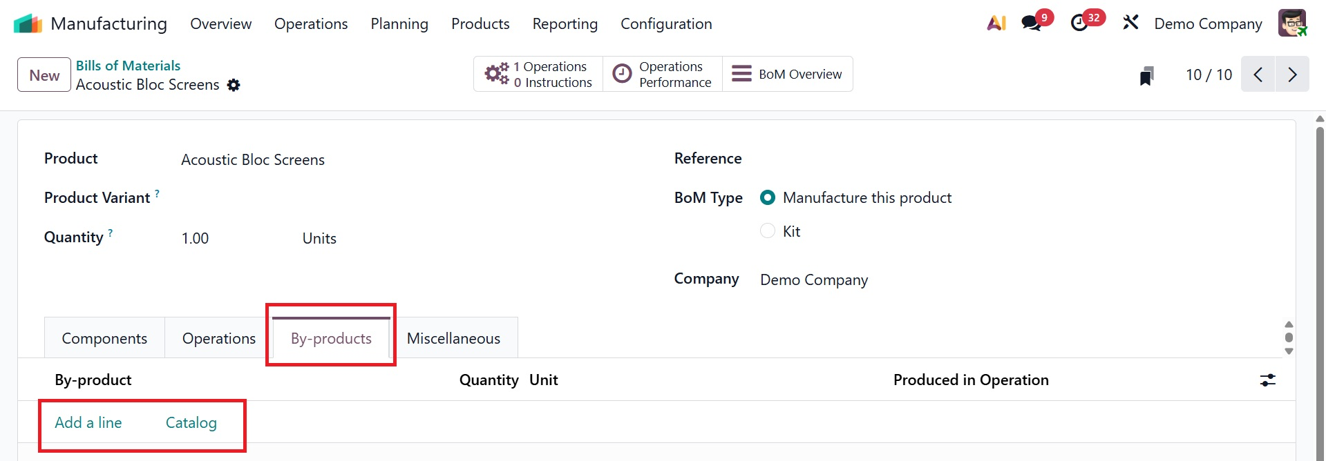 You can then add by-products by clicking the "Add a line" option under the by-product tab or by selecting directly from the product catalog window by clicking on the "Catalog" button, as shown in the screenshot below.