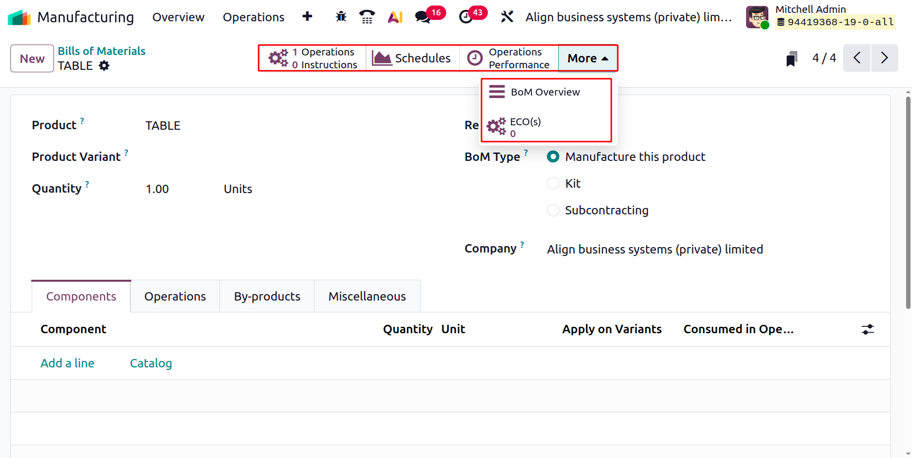 Components Tab: Next, use the Components tab's "Add a line" option to add components. As seen in the screenshot below, you can additionally indicate the quantity and unit of measurement for every product component.