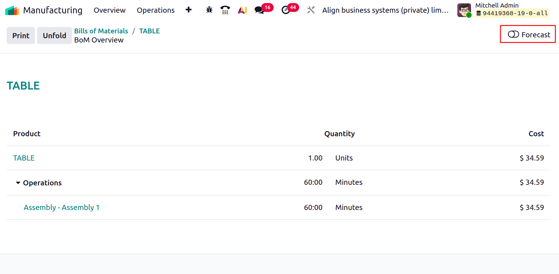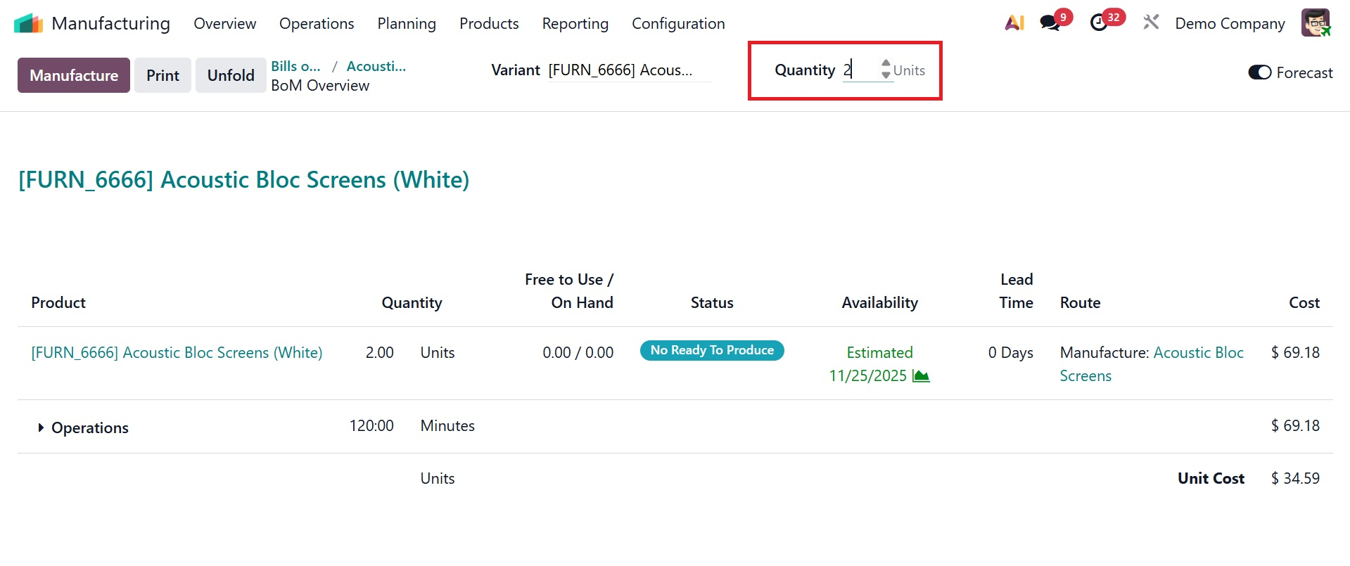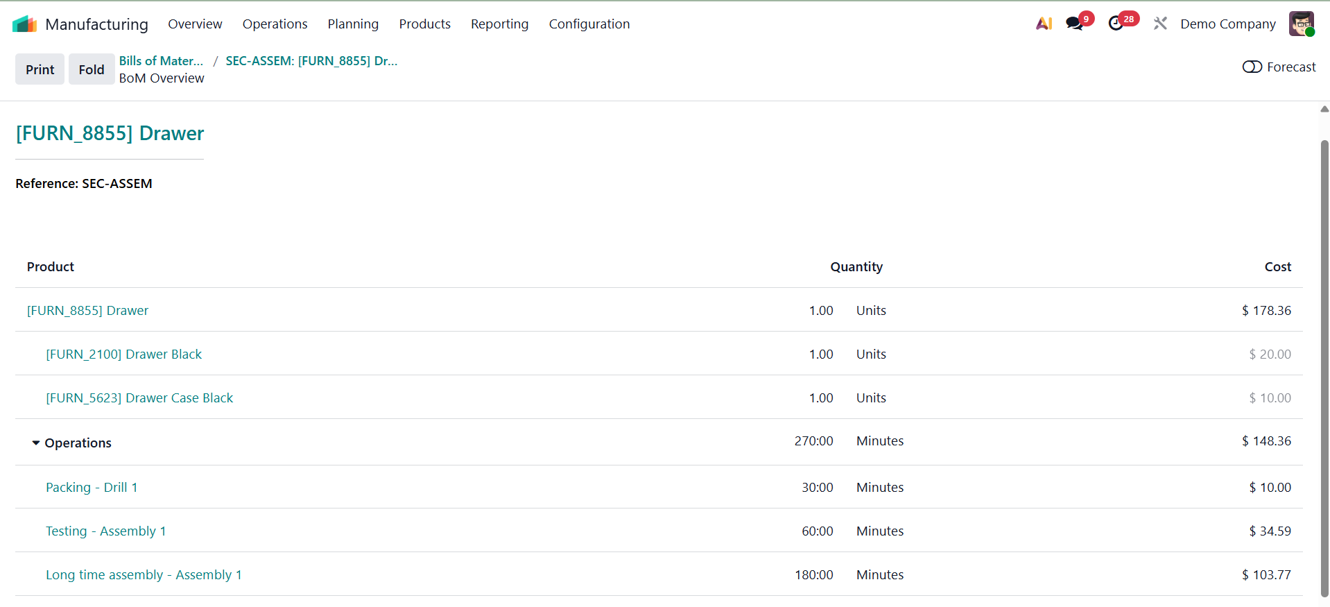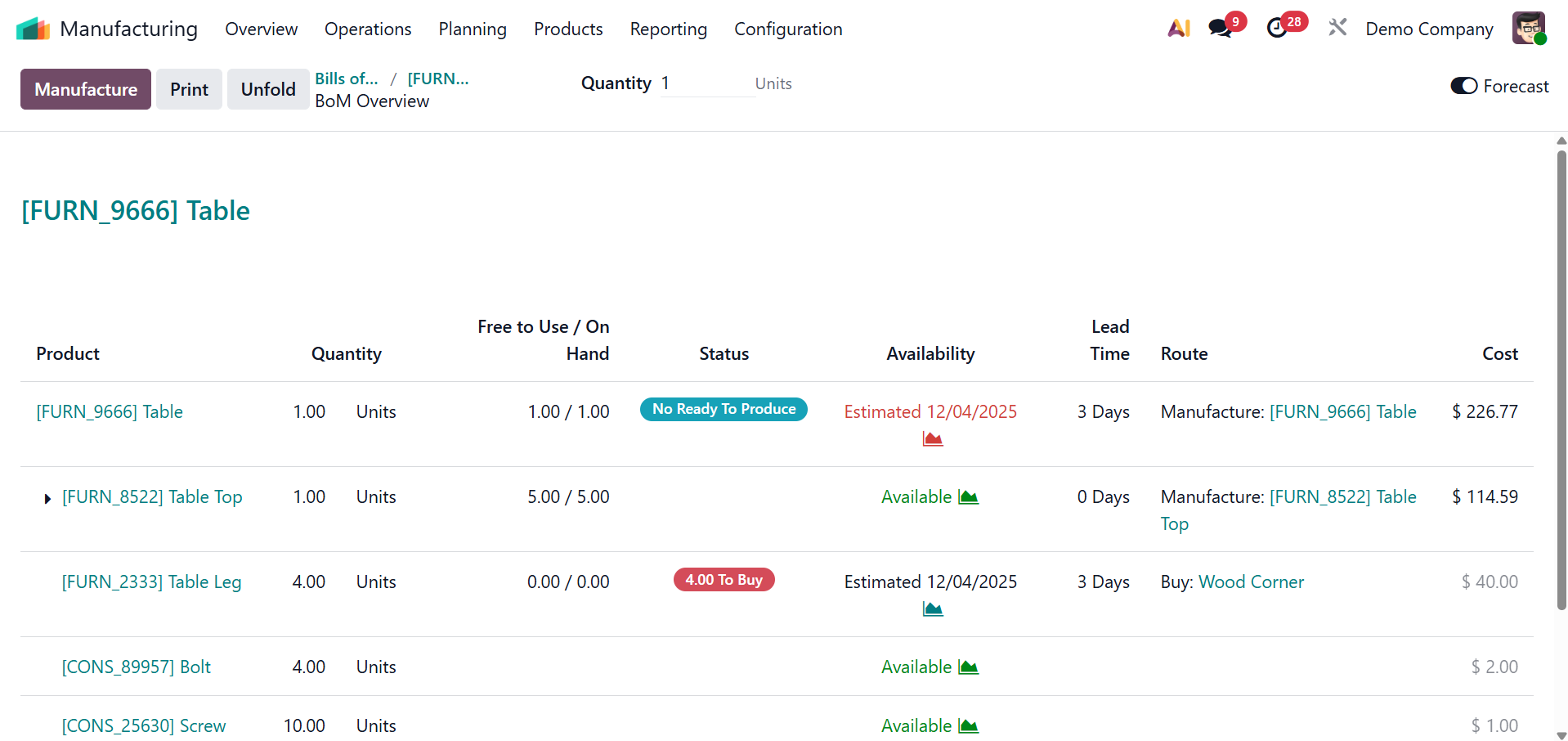 Here, in the bill of materials overview, you will get the details regarding the product, their quantity, free to use/on hand, status, availability, lead time, route, and cost respectively.