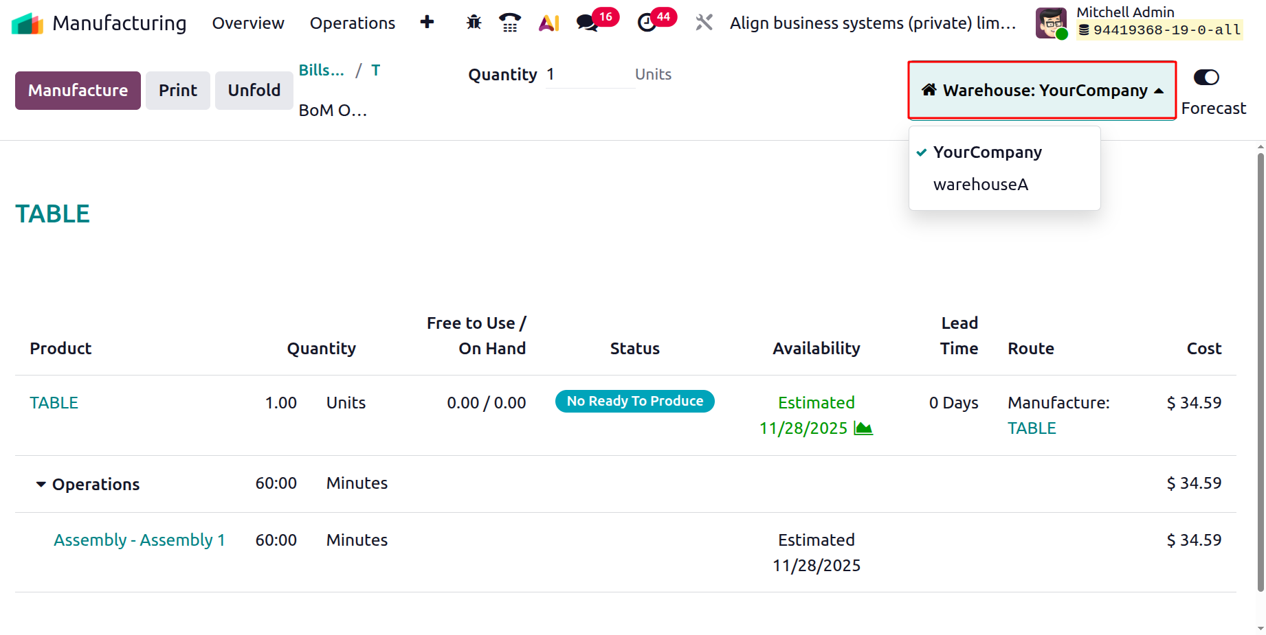If the company has more than one warehouse, from the bill of material the users can choose the Warehouse as shown below.