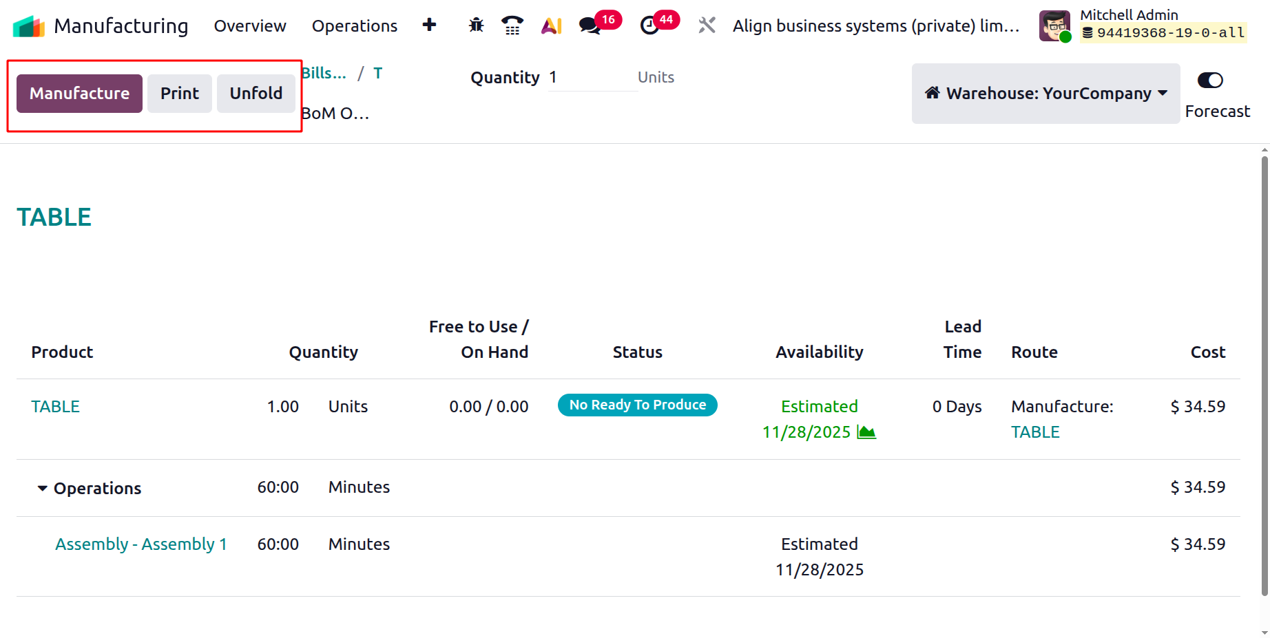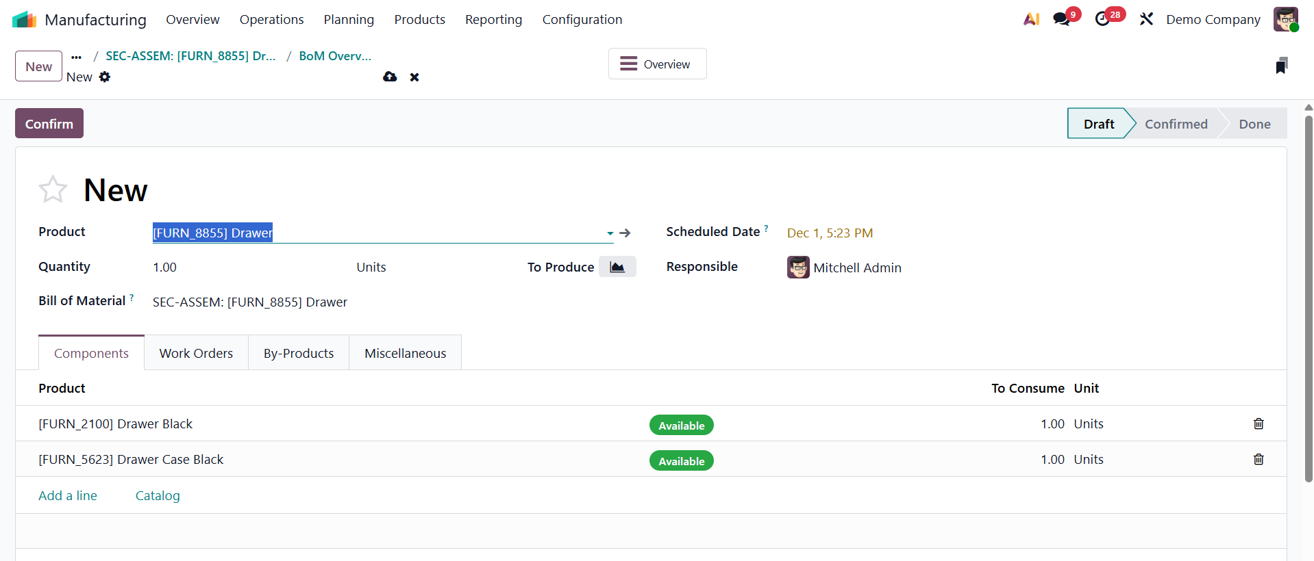 - Manufacture: Creates a new Manufacturing Order (MO) directly from the BoM Overview, using the selected Bill of Materials to initiate production immediately. On clicking the option, a new manufacturing order will be created.