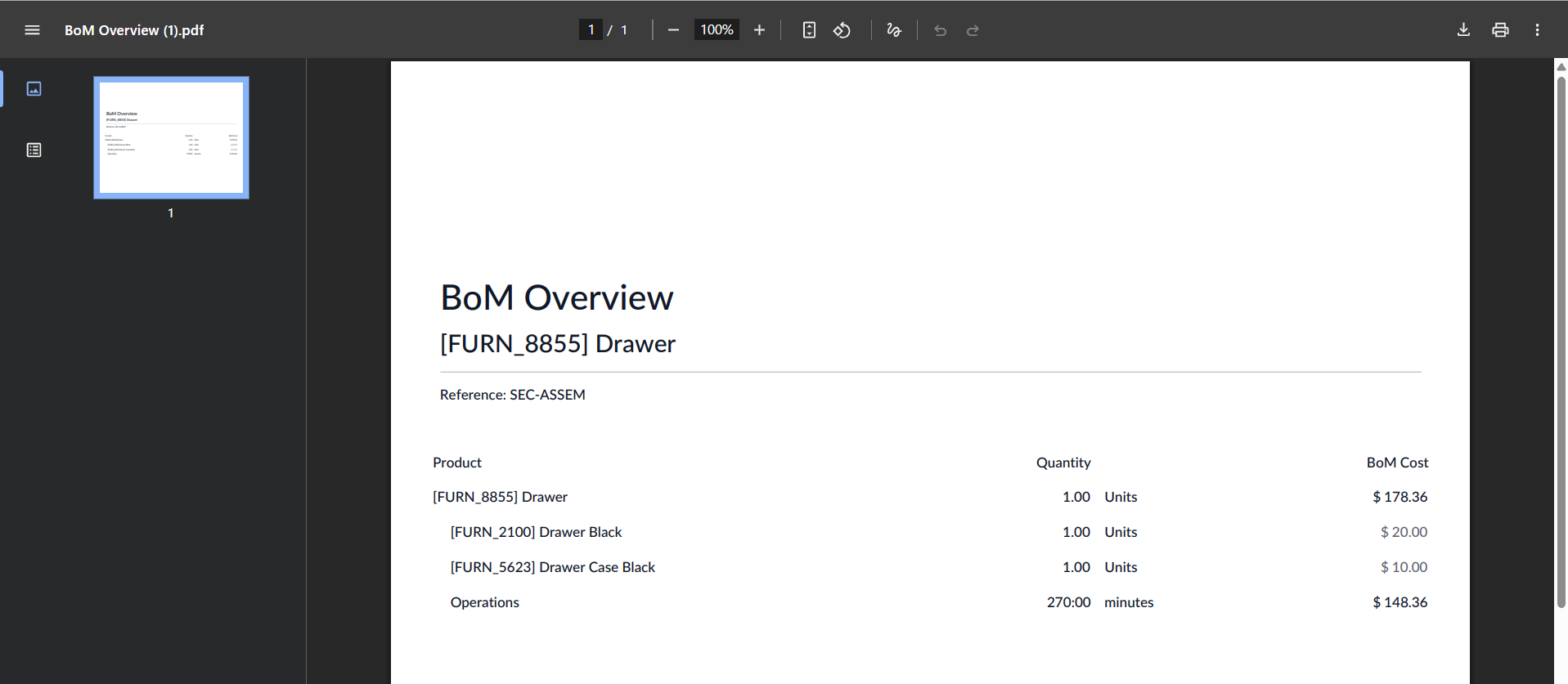- Print: Generates a PDF report of the BoM Overview, showing the complete component list, structure, and quantities in a clean, printable document.