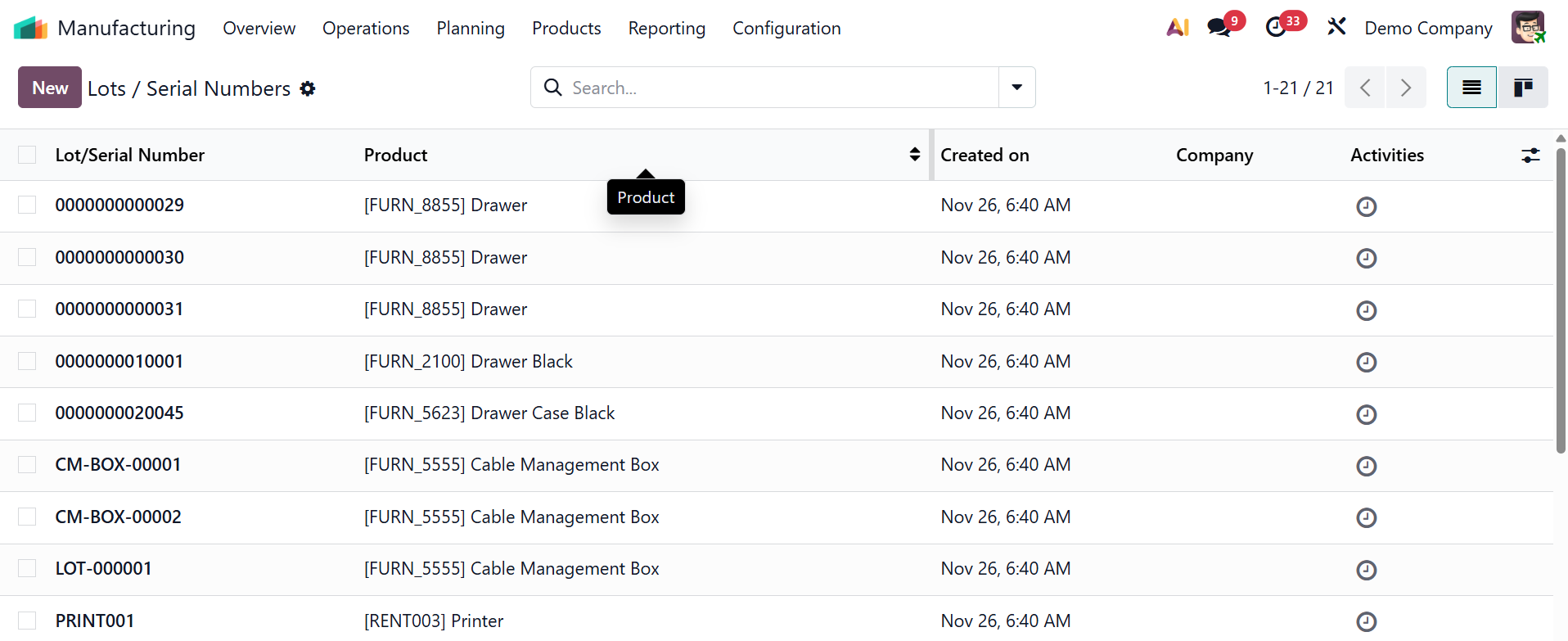 Lot/Serial Numbers are an effective tool for product traceability and quality control in Odoo 19's manufacturing module. It enables accurate tracking throughout the production process by giving items or batches individual identities. This function ensures accountability, streamlines recalls, and is especially helpful for companies that need to adhere to tight regulations.