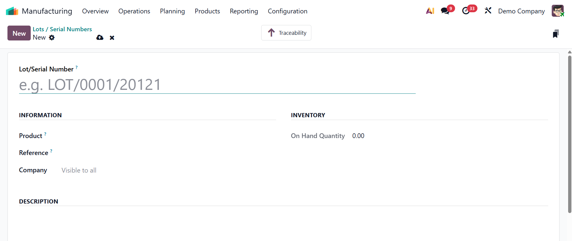 Additionally, this window's "New" button makes it easy to create new Lot/Serial numbers. Edit the data, such as the Lot/Serial Number, to suit your demands or your company's policies once a new creation window has started. The product, company, and internal reference number should then be stated. Under the INFORMATION field, you can add a unique serial number, product it belongs to, its amount, internal reference, and the company as well.