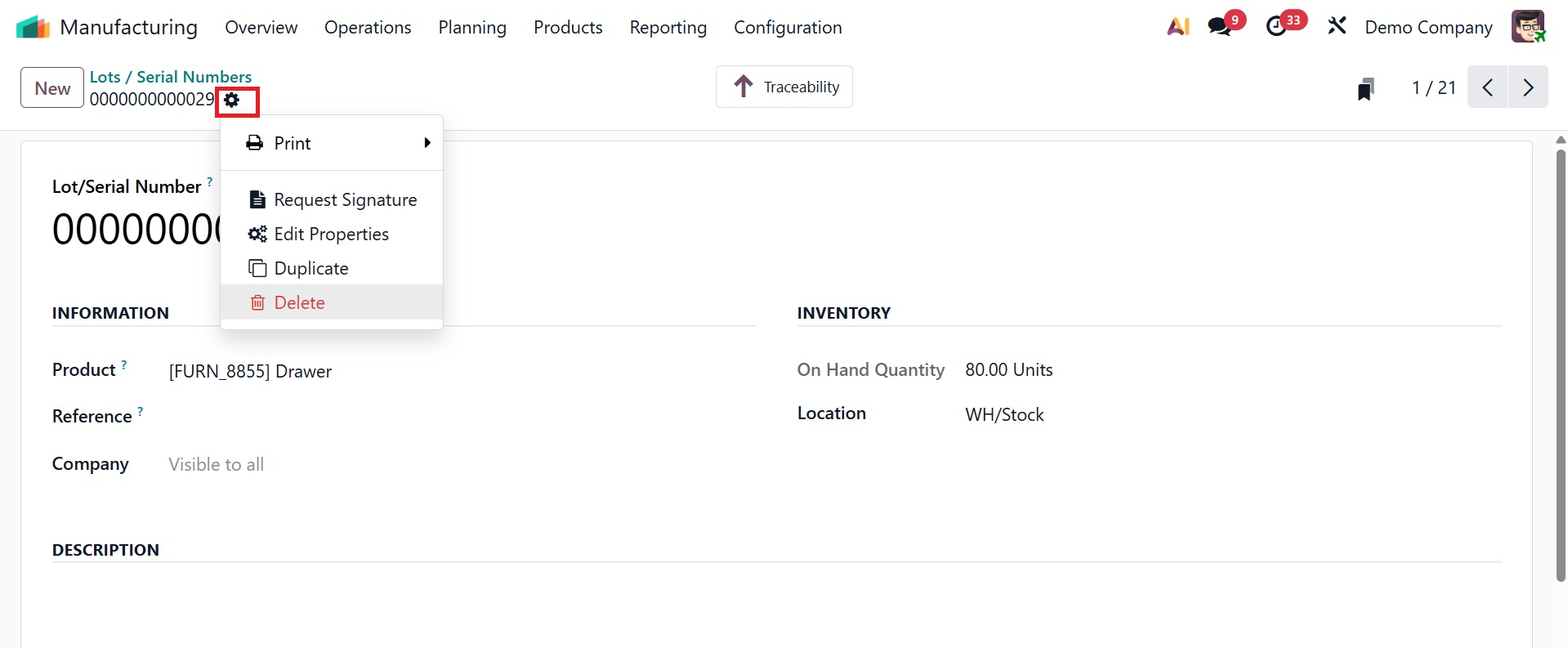 The lot/serial number can be printed, deleted, or duplicated using the action menu located on the upper left side of the configuration form.