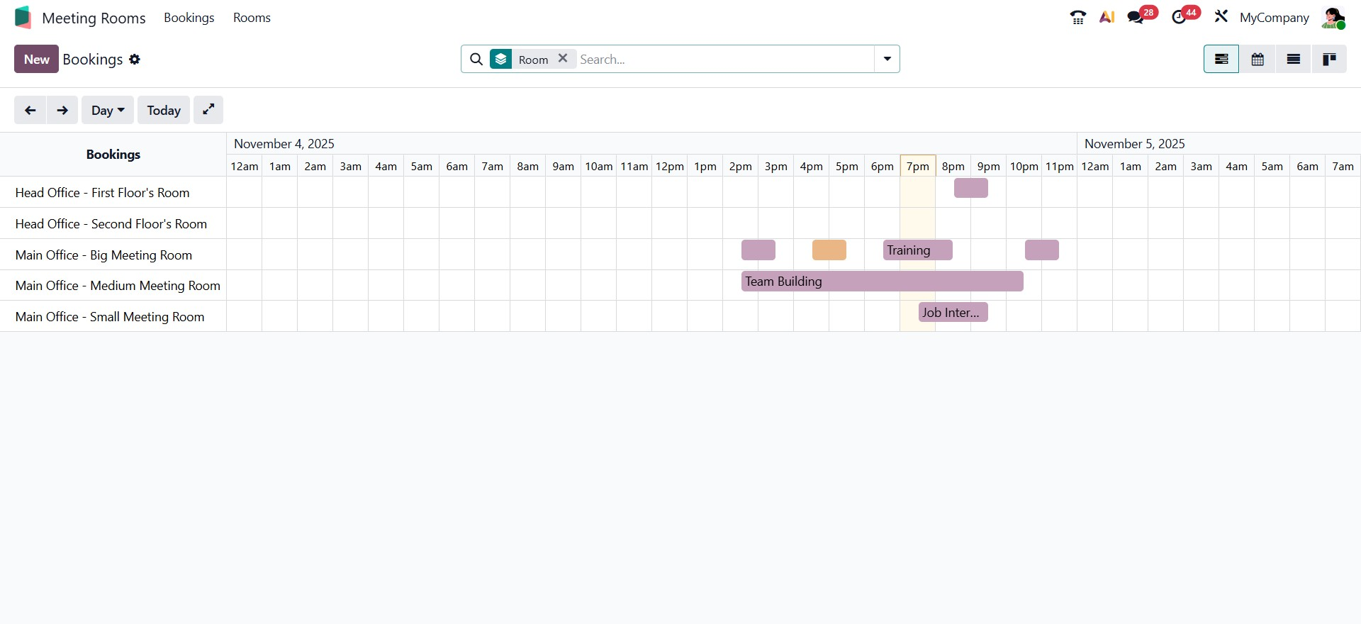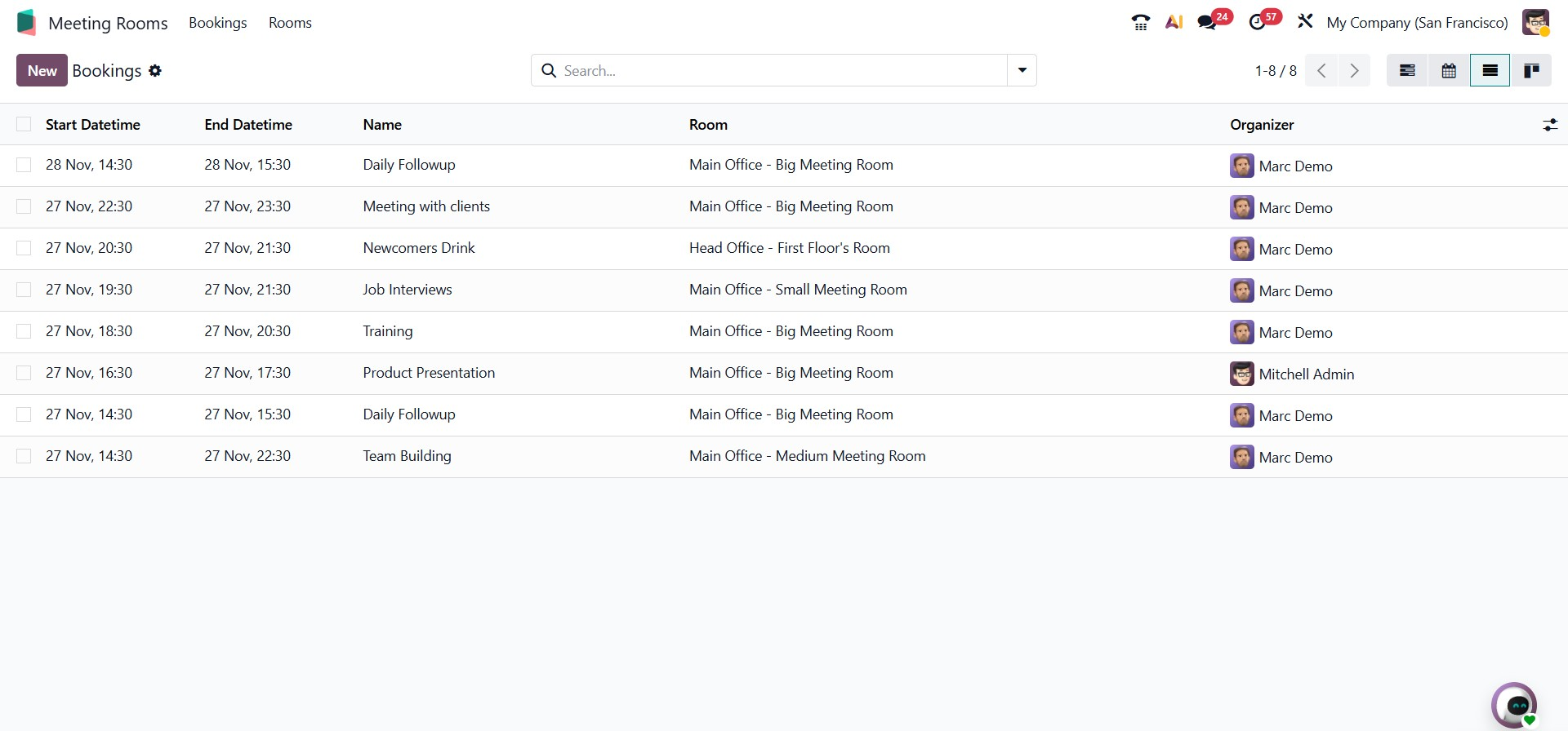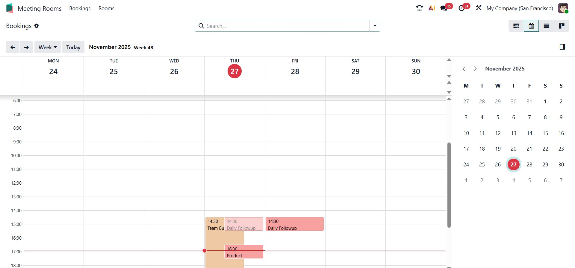 The Meeting Room module also supports multiple view modes for visualizing bookings. Other views, including the Calendar, List, and Kanban views, replace the Gantt chart. The Calendar view presents all meetings in a timeline format, which is particularly useful for managing daily or weekly schedules.
