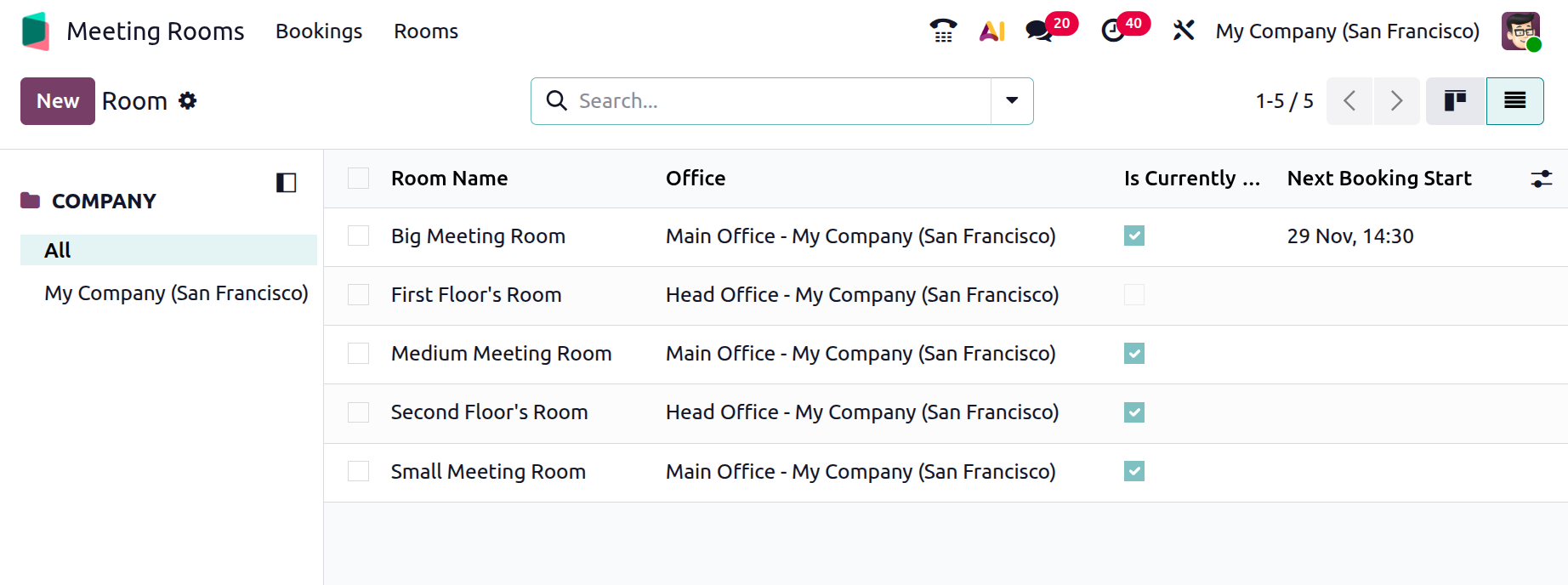 A green highlight means the room is available until the indicated time, while red signifies that the room is currently in use or booked. On the left-hand side, several filters are provided to help refine your view. You can choose to display all rooms or filter them by company, which is useful for multi-company environments.