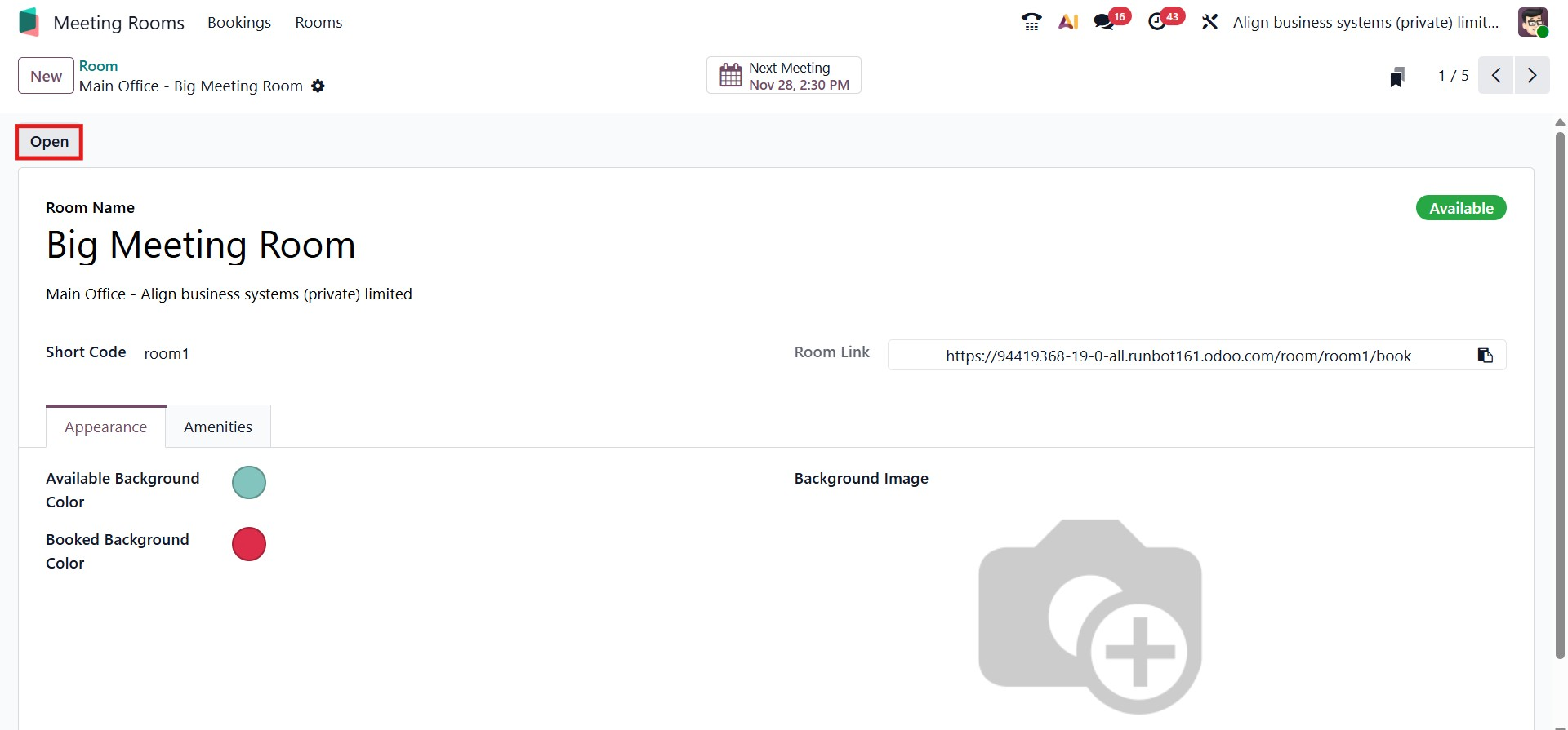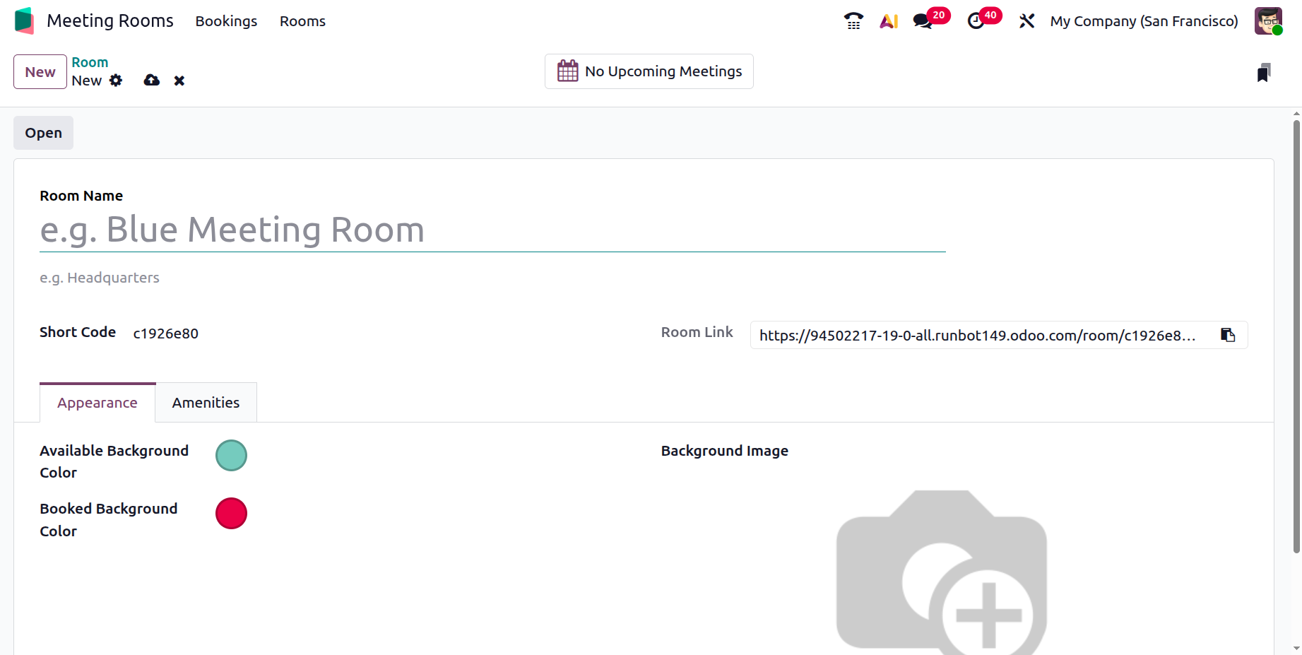 To create a new meeting room, click the New button. In the form view that opens, enter the room’s Name and Short Code. Using the Appearance section, you can define different background colors for the room when it is Available or Booked, allowing for quick visual identification. You may then upload a Room Image, after which the Room Booking Form URL will appear automatically. Any additional notes or details about the room can be added under the Amenities tab. Once completed, save the new room.