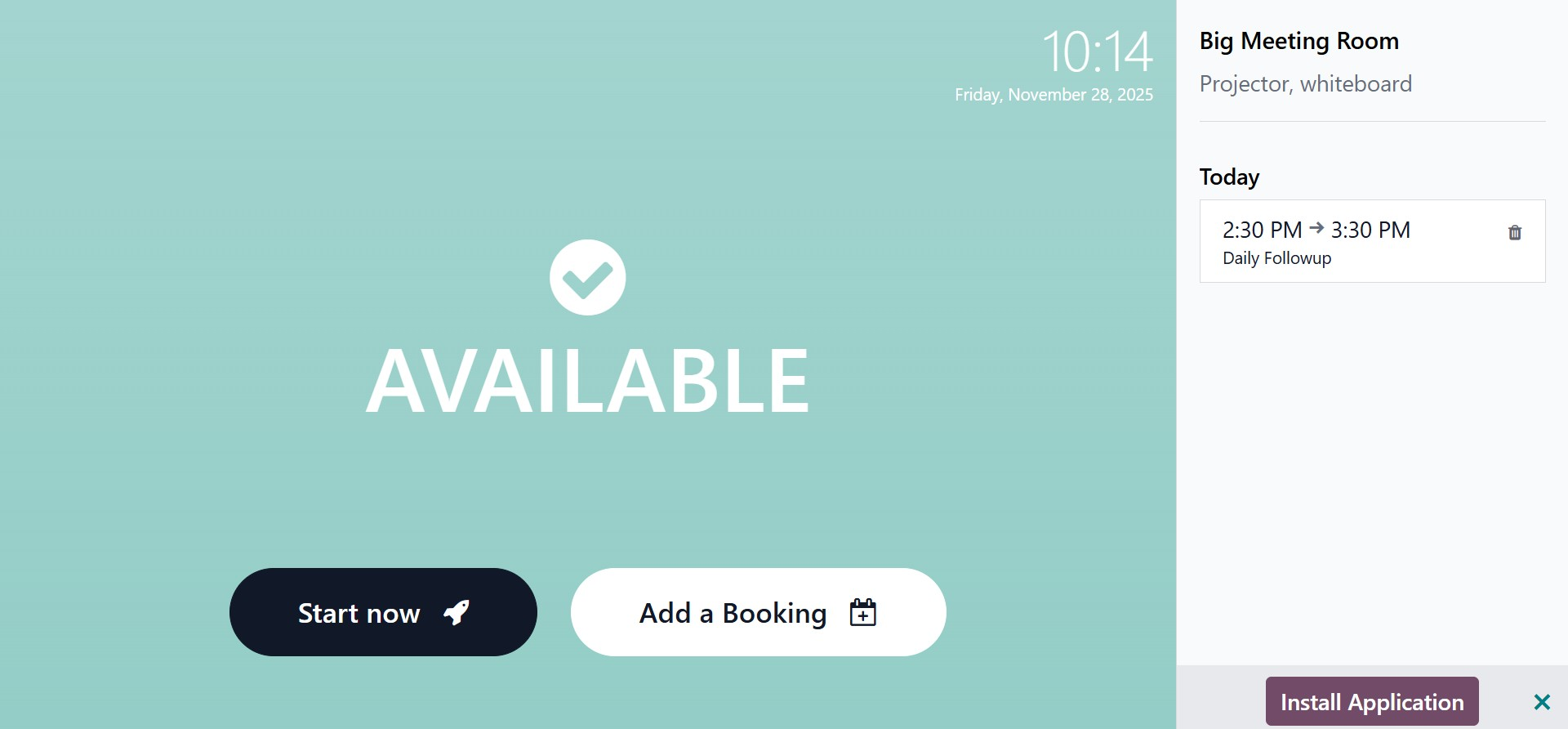 When you click the Open button, the system displays the room’s booking interface. The background color reflects the color selected in the Appearance settings; for instance, blue if that was configured. This page includes options such as Start Now and Add a Booking.