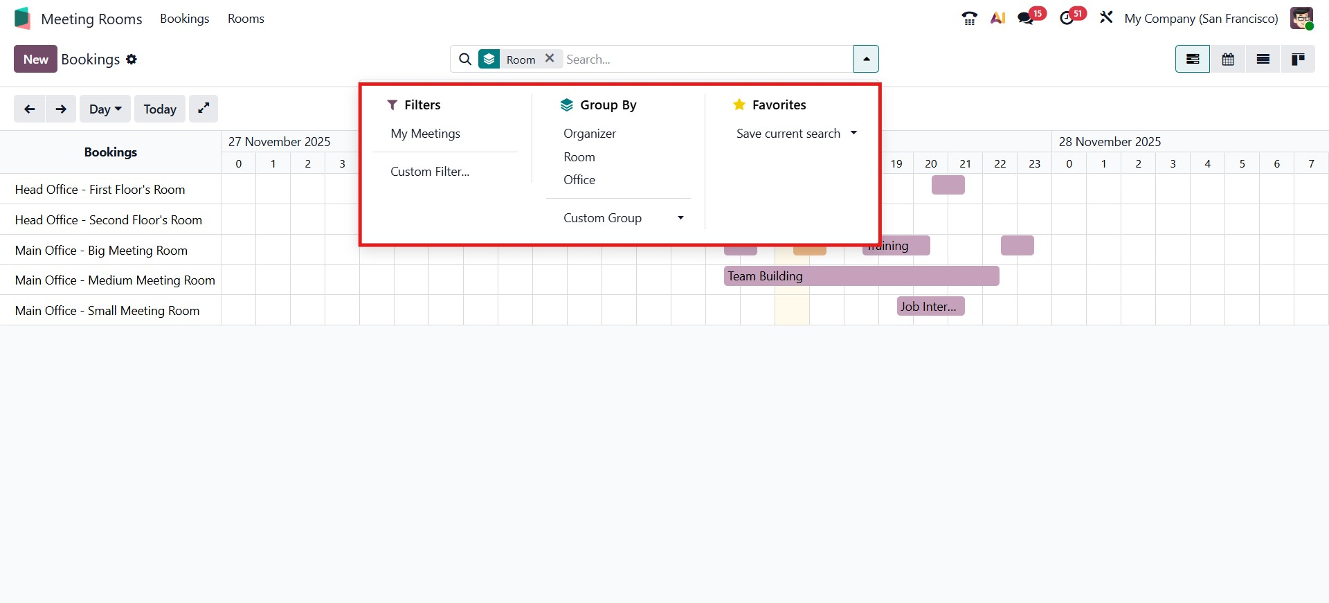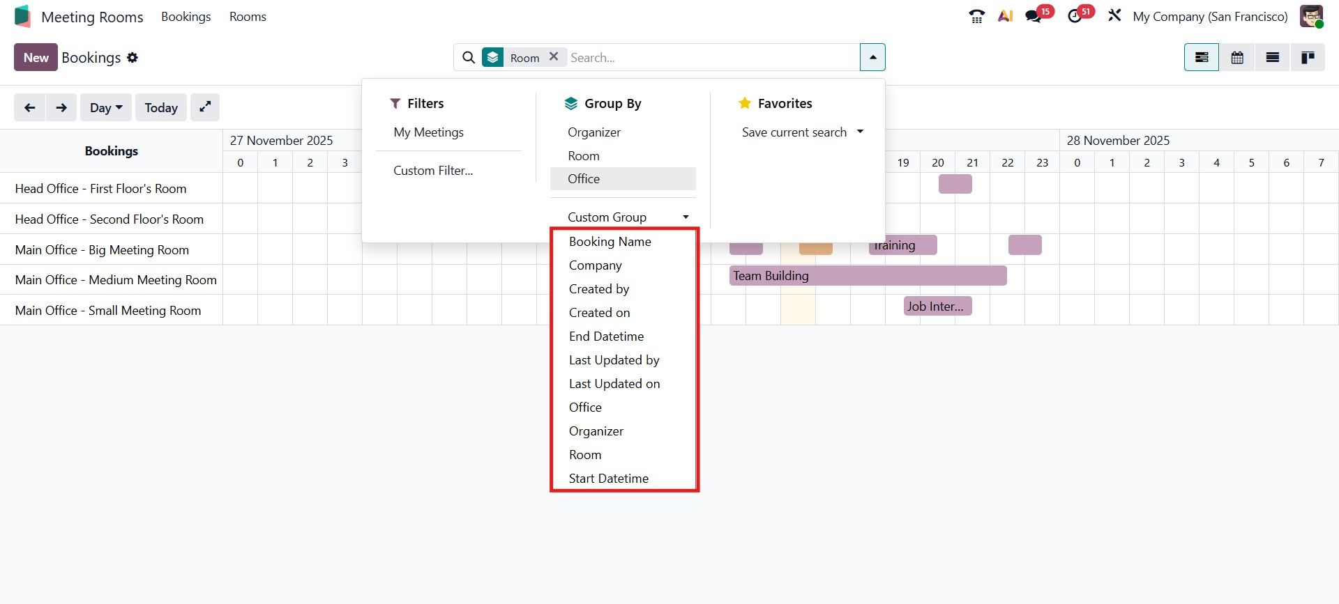 At the top of the dashboard, users can access a powerful search bar that includes Filters, Group By, and Favorites options. These tools help narrow down meeting records based on specific criteria. The My Meetings filter, for example, instantly displays meetings associated with the logged-in user. Users can also group bookings according to the meeting organizer, room, or office location, making it easier to manage reservations in large organizations.