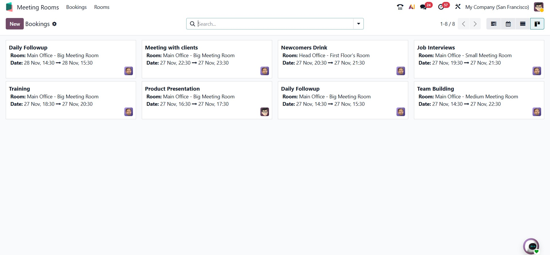 Meanwhile, the Kanban view offers a visual layout where meetings are organized into cards, providing a clear and dynamic overview of room usage and meeting status.