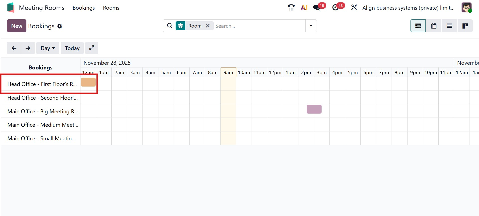 The newly created meeting then appears instantly in the selected view, ensuring that everyone in the organization can see the updated schedule and room availability.