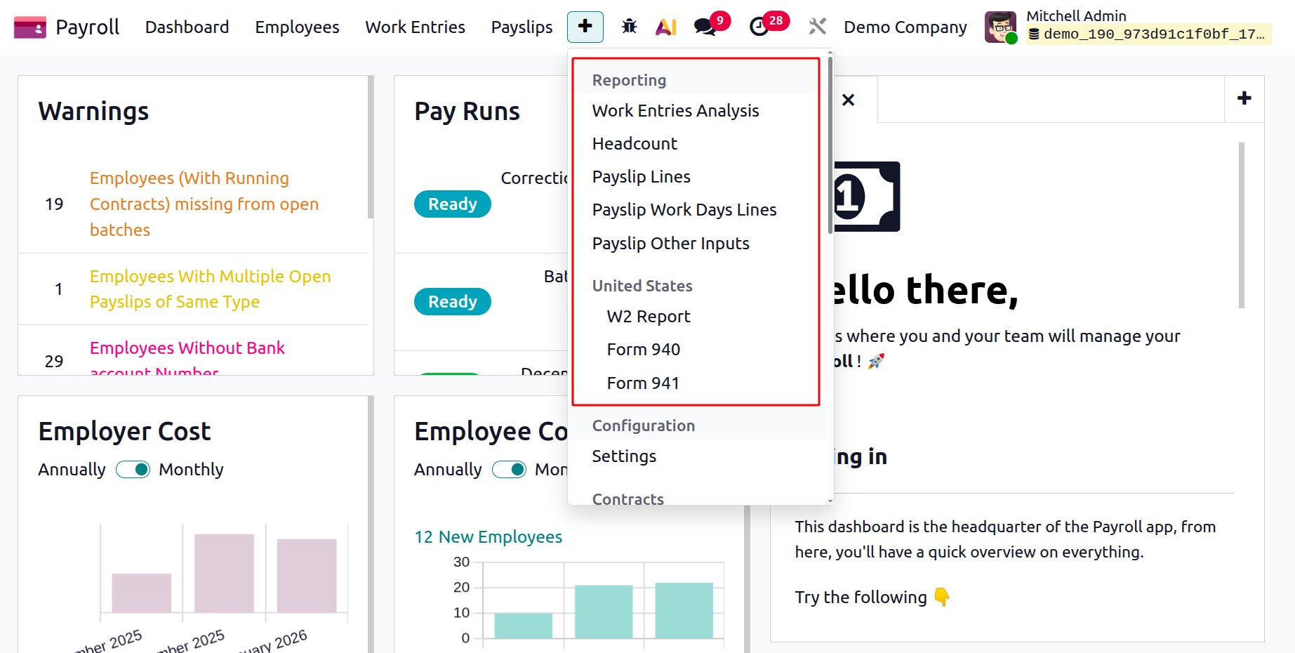 - W-2 Report:Produces the yearly wage and tax statement needed for filing U.S. taxes, which summarizes each employee's earnings, contributions, and withholdings.