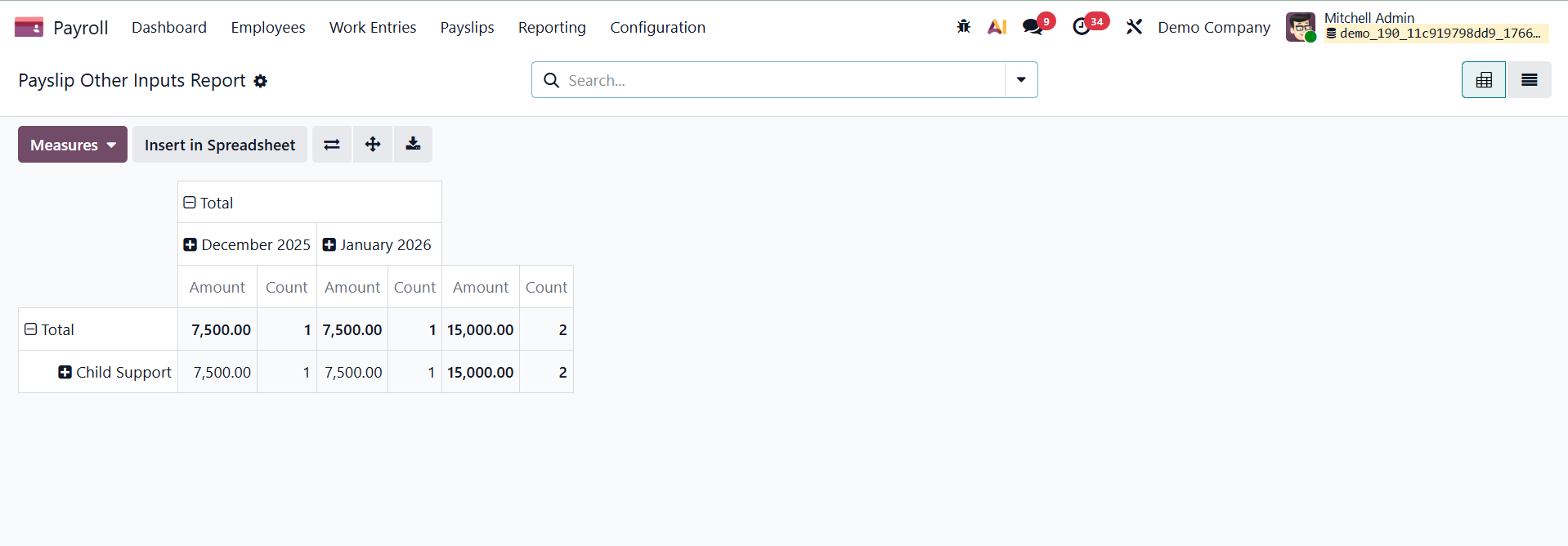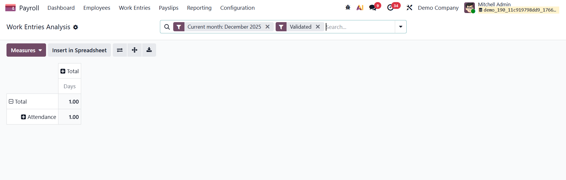 After choosing the Work Entry Analysis menu from the Reporting tab, the user is shown a tabular report. Job entry analysis by attendance, sick days, unpaid time off, and other variables is included in the pivot table. The Measures button makes it simple to assess the task input in terms of metrics, like a day or count.