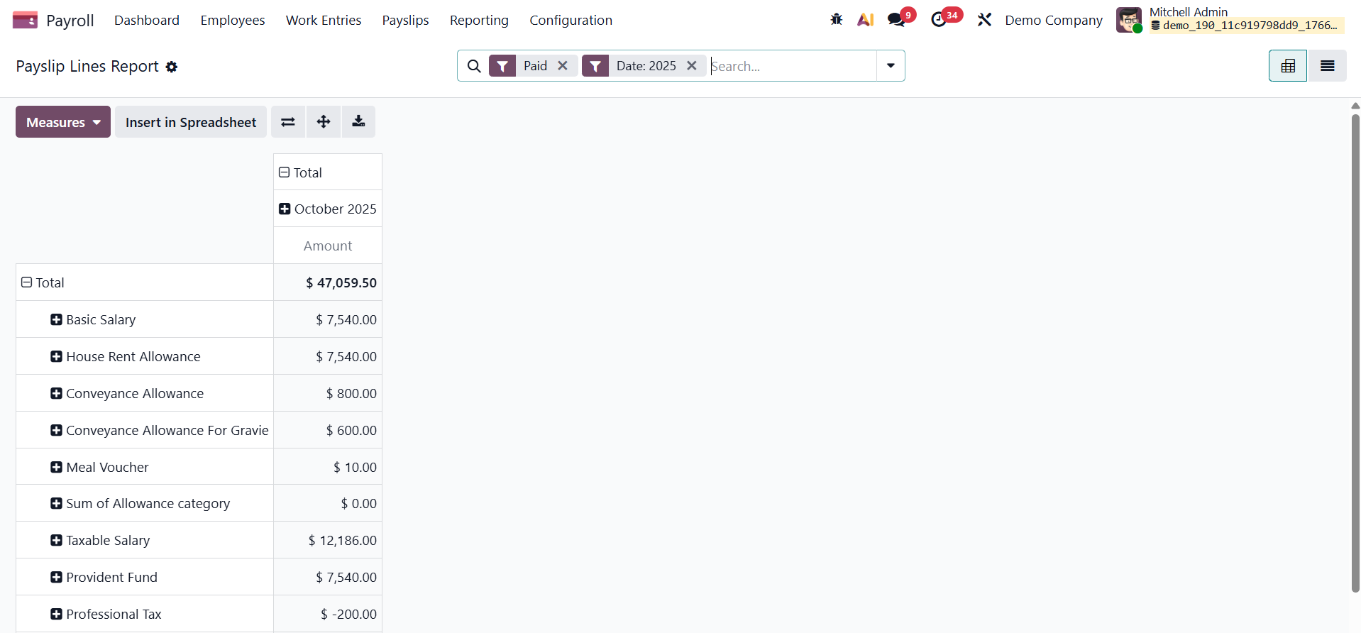 The Payslip Line option under the Reporting menu of the Odoo Payroll module provides a detailed breakdown of individual salary rule lines from generated payslips, allowing HR and finance users to analyze earnings, deductions, and contributions across employees and pay periods.