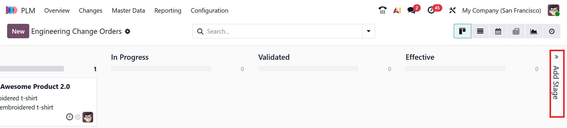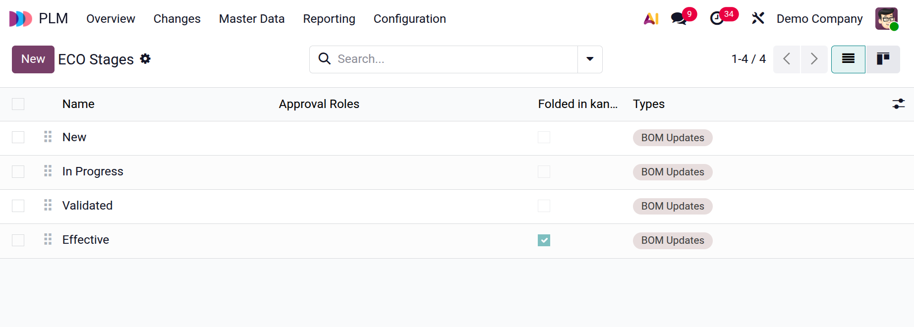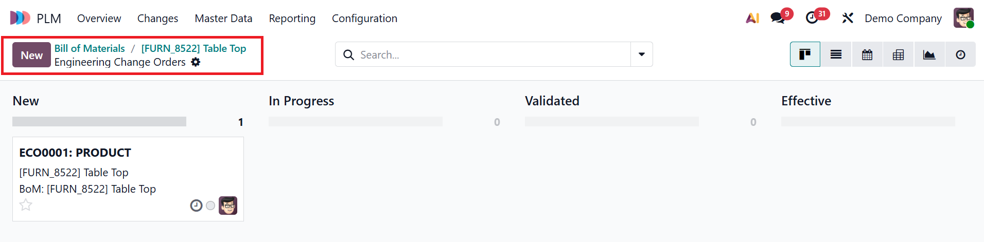The new ECO will move from the New stage to In Progress, Validated, and Effective stages.