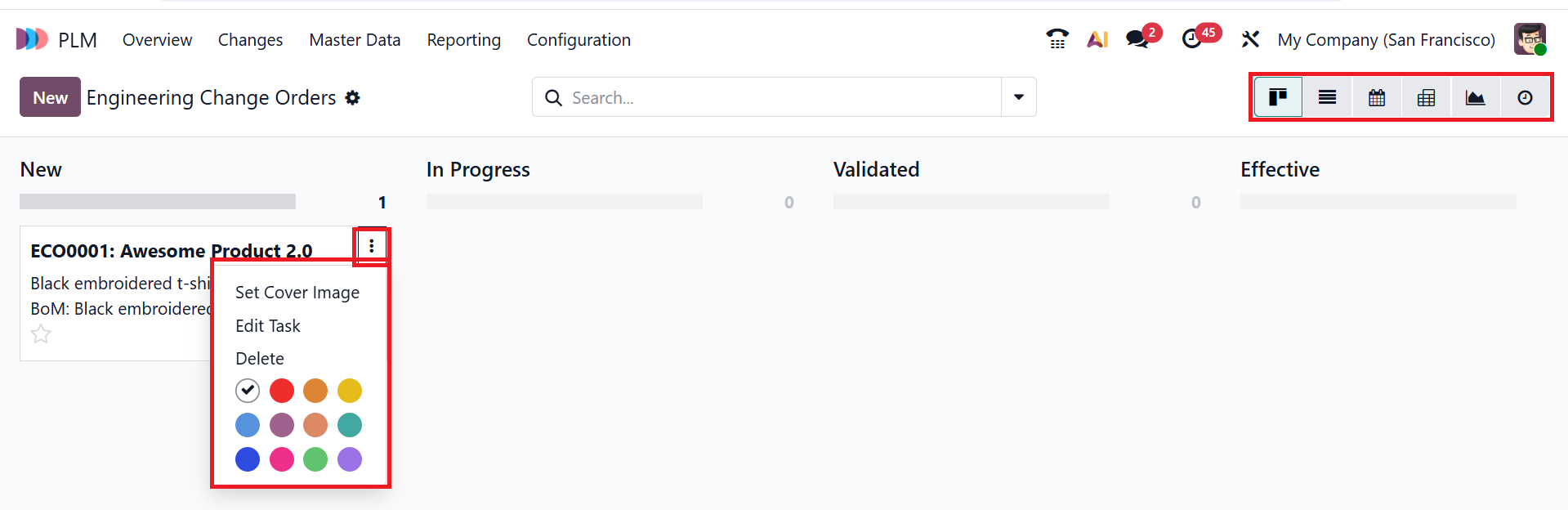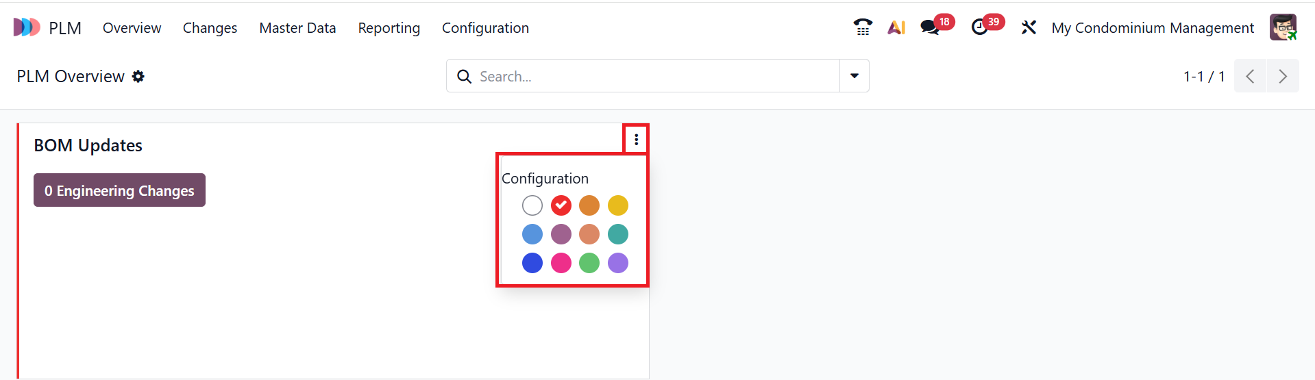 By default, the Overview menu displays the PLM module's main dashboard. The details of the engineering change orders can be viewed here. Each order is organized into cards by ECO type to facilitate easy tracking of engineering modifications. Click on the three-dotted vertical line in the upper-right corner of the card to add a color to the specific card. The Configuration option allows you to view the selected ECO type form.