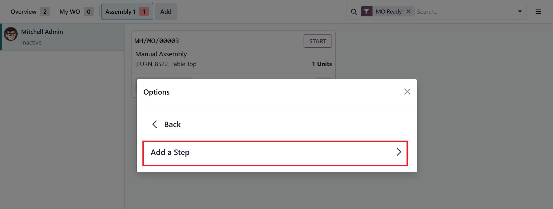You can also create an ECO from the Manufacturing module. In the Shop Floor module, click on the advanced menu bar in the work order that was previously configured in the Manufacturing module. Then, select the Update Instructions option as shown below: