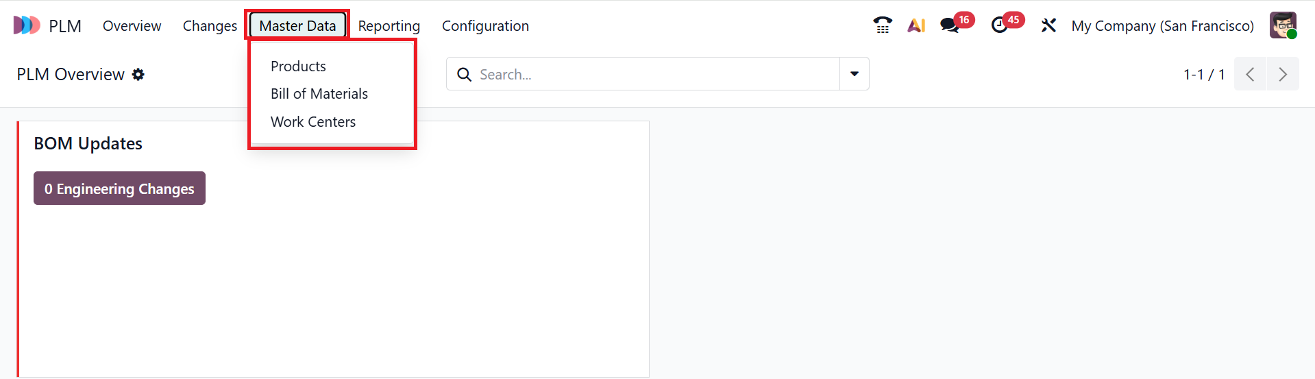 You can view five menus in the PLM module: Overview, Changes, Master Data, Reporting, and Configuration.