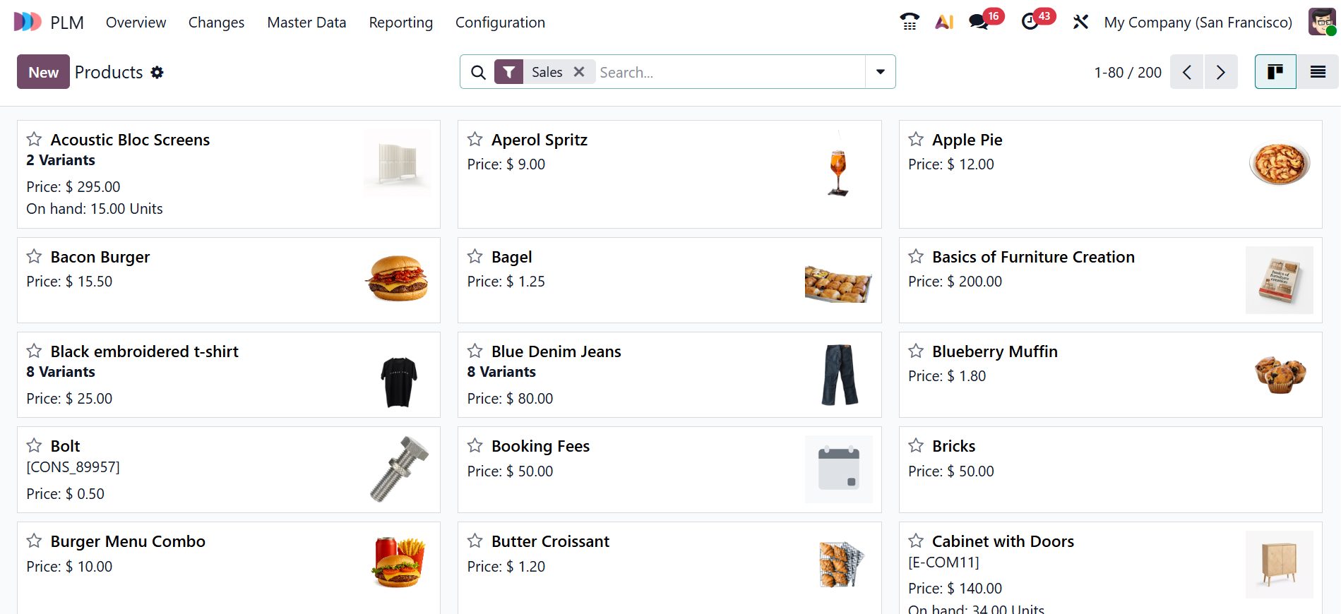 The Products option in the Master Data menu of the Odoo 19 PLM module stores all product details linked to engineering and manufacturing. It helps teams manage product variants, BoMs, and related engineering documents. You can view the Products option in either Kanban or List views.