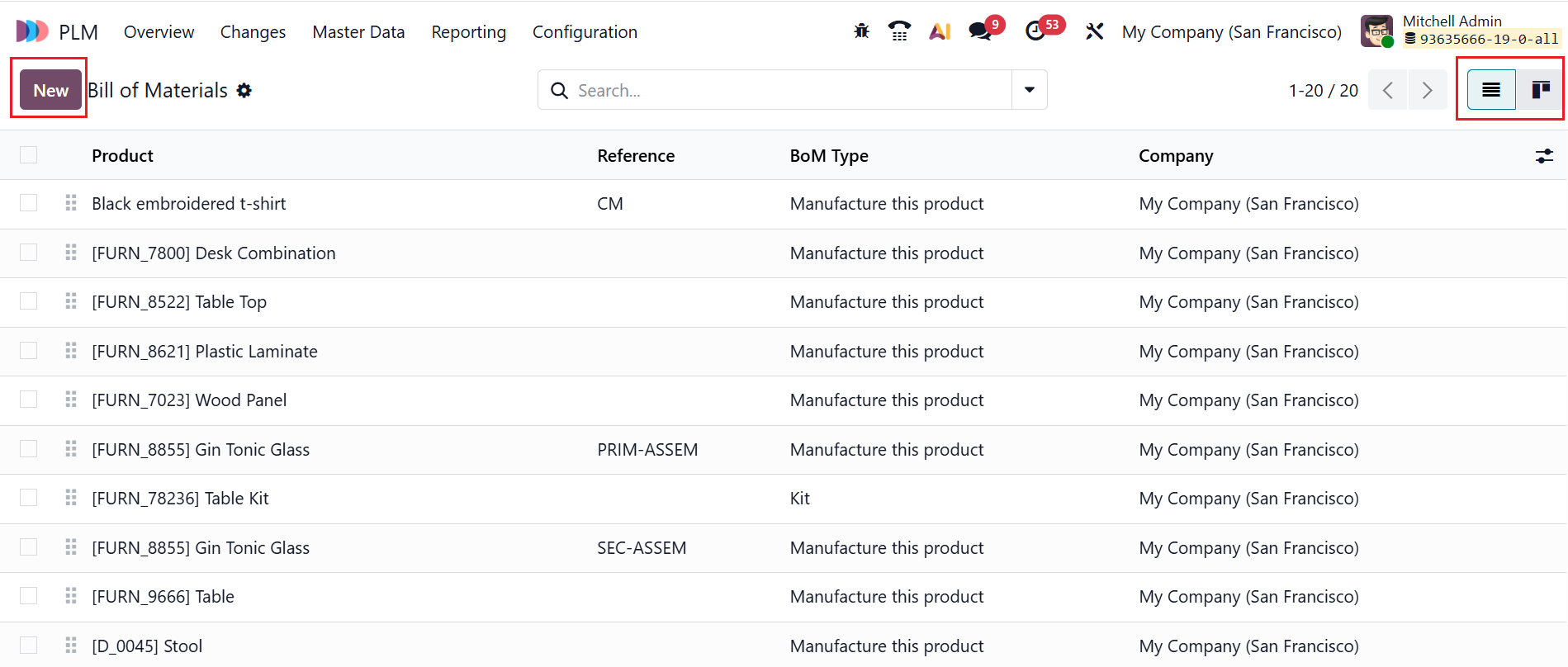 In Odoo 19 PLM, the Bill of Materials (BoM) outlines all the products, materials, and operations required to manufacture a product. It can be viewed in both Kanban and List views. Here, you can view the details of the BoM as Product, Reference, BoM Type, and Company.