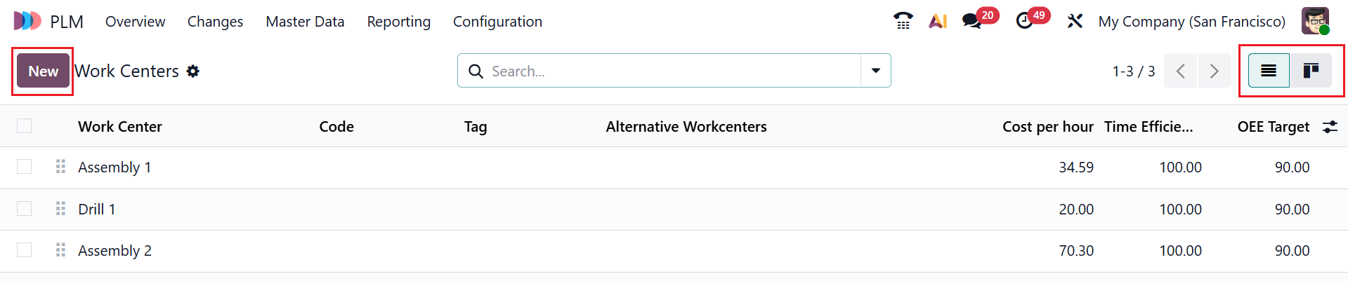 Here, you can view the work center details, including Work Center, Code, Tag, Alternative Workcenters, Cost per hour, Time Efficiency, and OEE Target. You can also view the work centers in Kanban and List views. Click the New button to create a new work center.