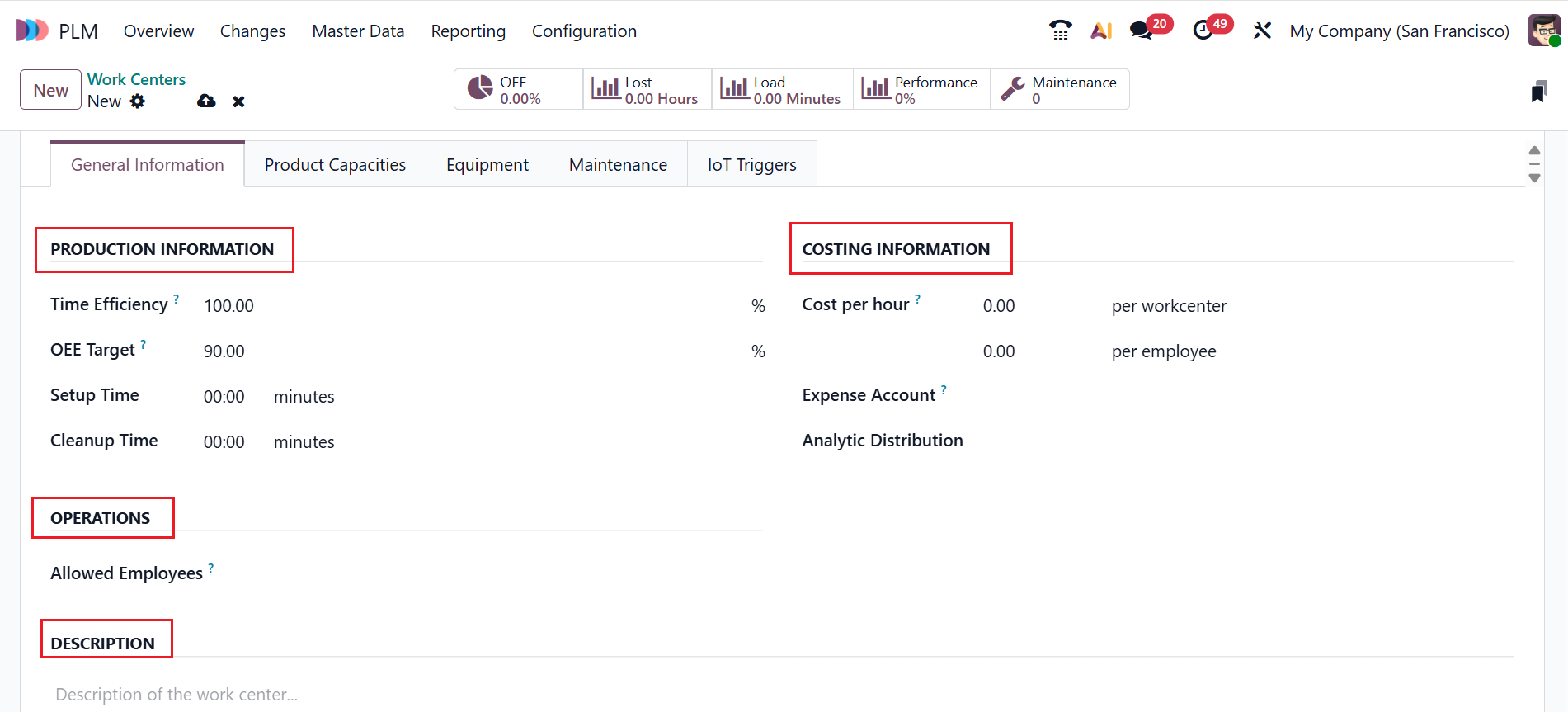 Under the General Information tab, you can view four options: Production Information, Costing Information, Operations, and Descriptions. You can add Time Efficiency, OEE Target, Setup Time, and Cleanup Time of a work order at this work center under the Product Information option. You can add Cost per hour, Expense Account, and Analytic Distribution under the Costing Information option. In the Operations option, add the employees who can log in to the workcenter in the Allowed Employees field. Under the Description option, add a description of the work center.
