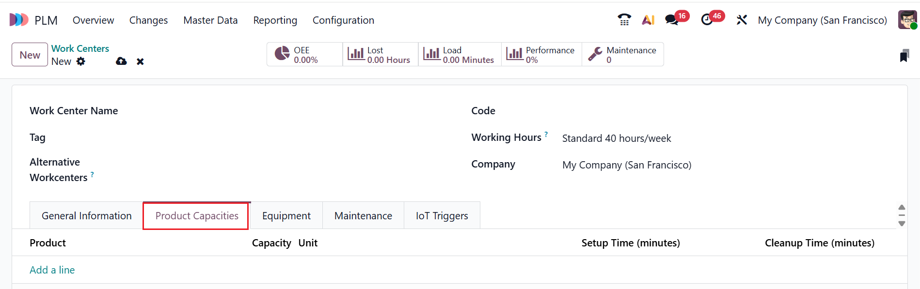 Under the Product Capacities tab, click on the Add a line button to add a work center capacity for each product, which is used to add new equipment.