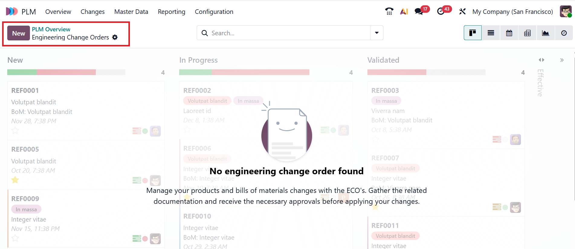 Click on the specific ECO type to view more details about the associated changes. In the screenshot below, you can see that there are no Engineering Change orders to manage products or their bill of materials.