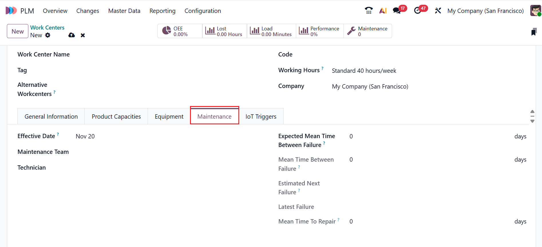 You will find five smart tabs here: OEE, Loss, Load, Performance, and Maintenance. The OEE smart tab shows how efficiently a work center is running. The Lost smart tab shows the time lost due to breakdowns or other production interruptions. The Load smart tab indicates the total workload or capacity assigned to a work center. The Performance smart tab reflects how fast and effectively the work center completes operations. The Maintenance smart tab tracks maintenance activities required or performed to keep the work center operational.