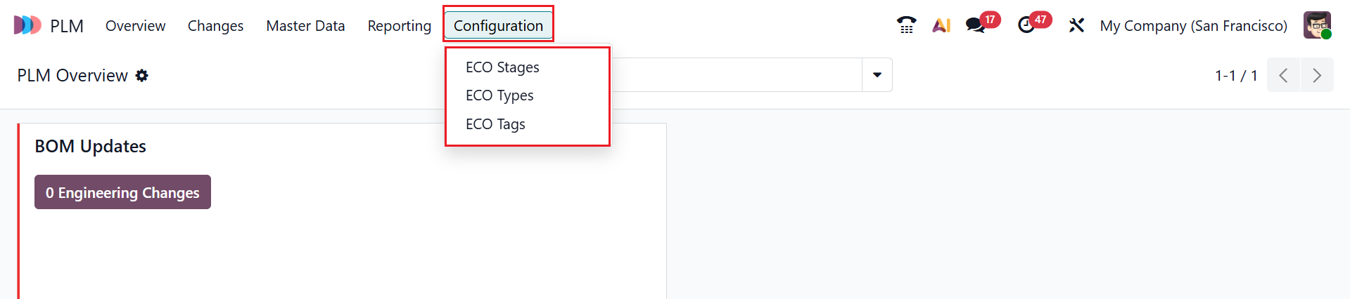 The Configuration menu in the Odoo 19 PLM module helps to customize and control how engineering changes, product documents, and production processes are managed across the system. Under the Configuration menu, you can see three options: ECO Stages, ECO Types, and ECO Tags.