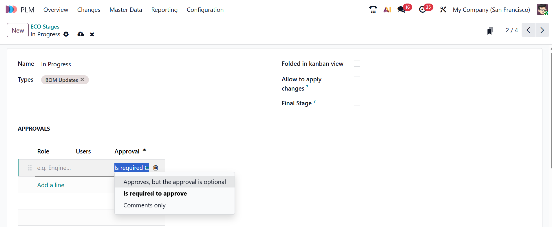 - Is required to approve: The ECO cannot move to the next stage unless the assigned approver gives formal approval.