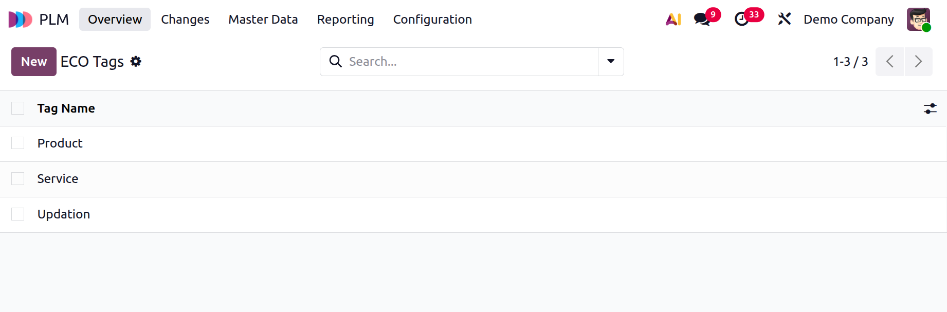 ECO Tags are labels you can add to ECOs to quickly identify or filter them. To create an ECO Tag, click on the New button and add a Tag Name and save it.
