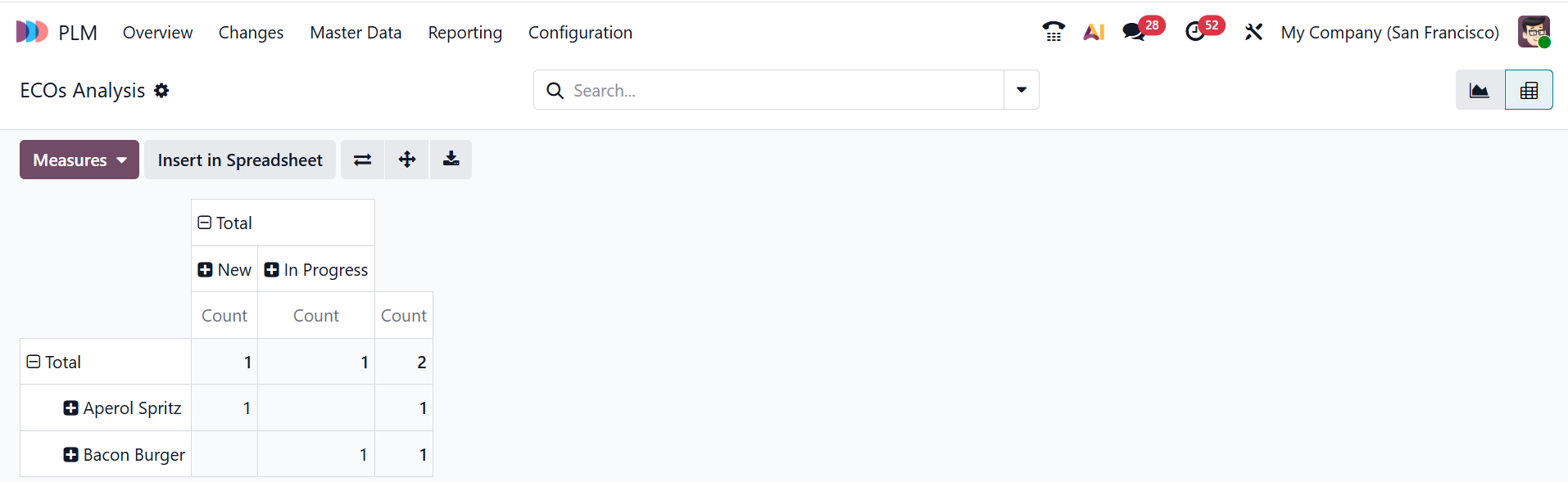 In the Pivot view of ECOs Analysis, you can analyze data in a summary table to easily compare and group it.