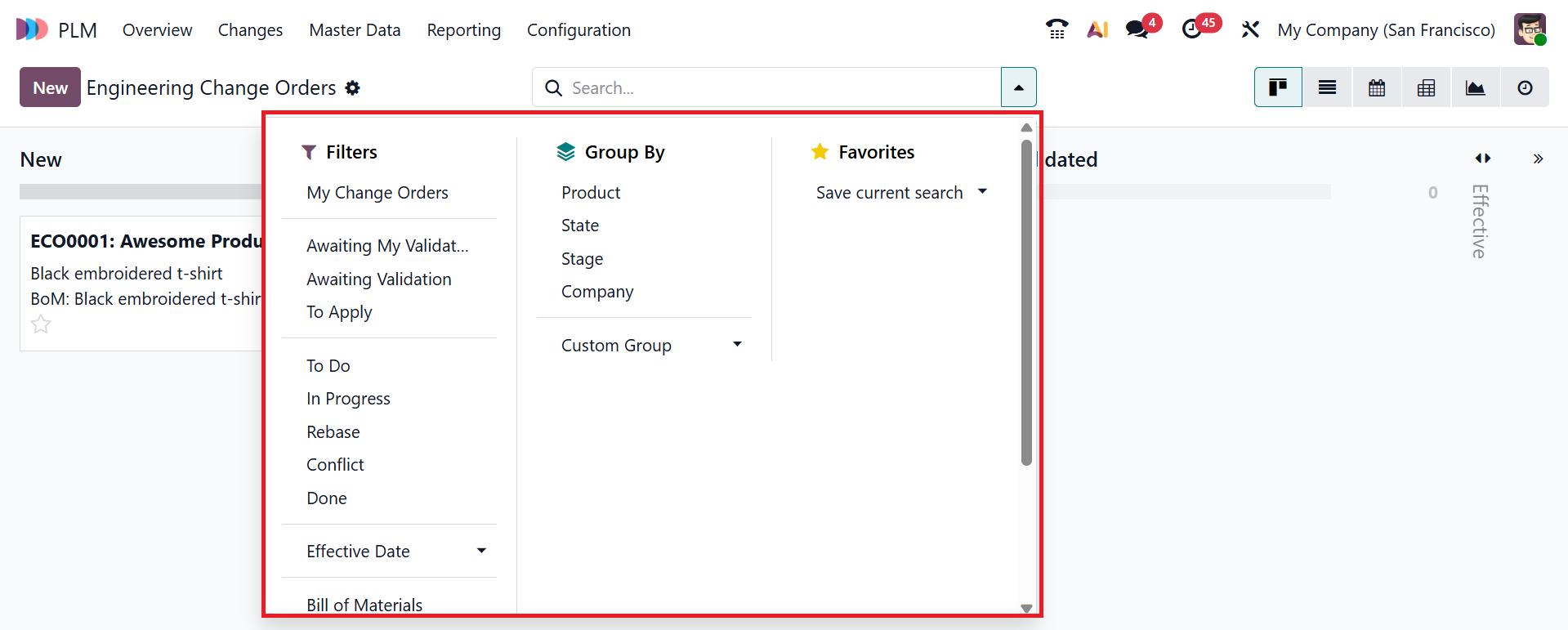 When you click on the drop-down menu in the search bar, you can view the options such as Filters, Group By, and Favorites. You can use the Filters option to sort the data based on My Change Orders, Awaiting My Validation, Awaiting Validation, To Apply, To Do, In Progress, Rebase, Conflict, Done, Effective Date, Bill of Materials, and Archived. You can also use custom filters and AI options. Under the Group By option, you can group the data by Product, State, Stage, Company, or use a custom group option. The Favorites option allows you to save searches for future use.