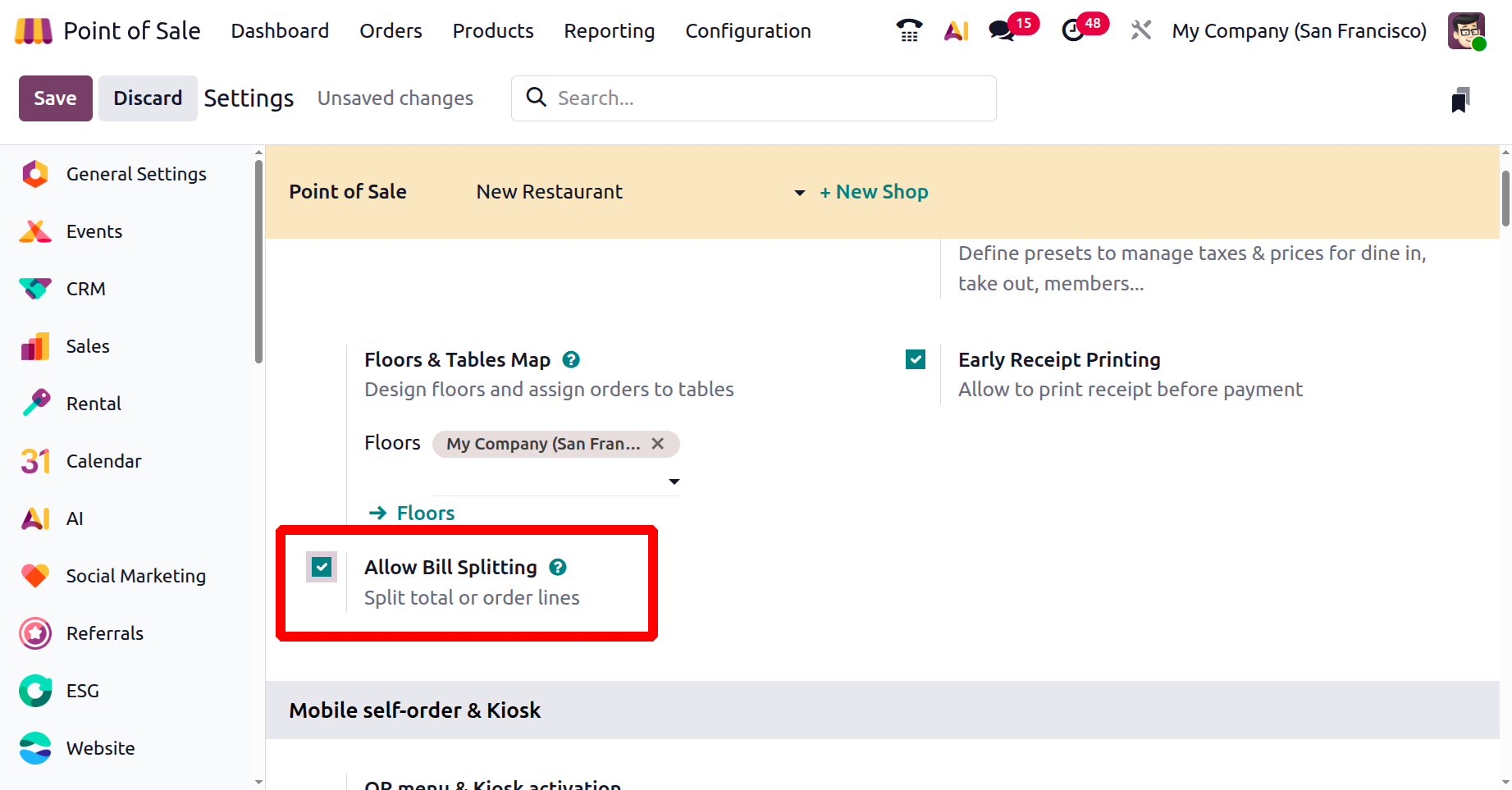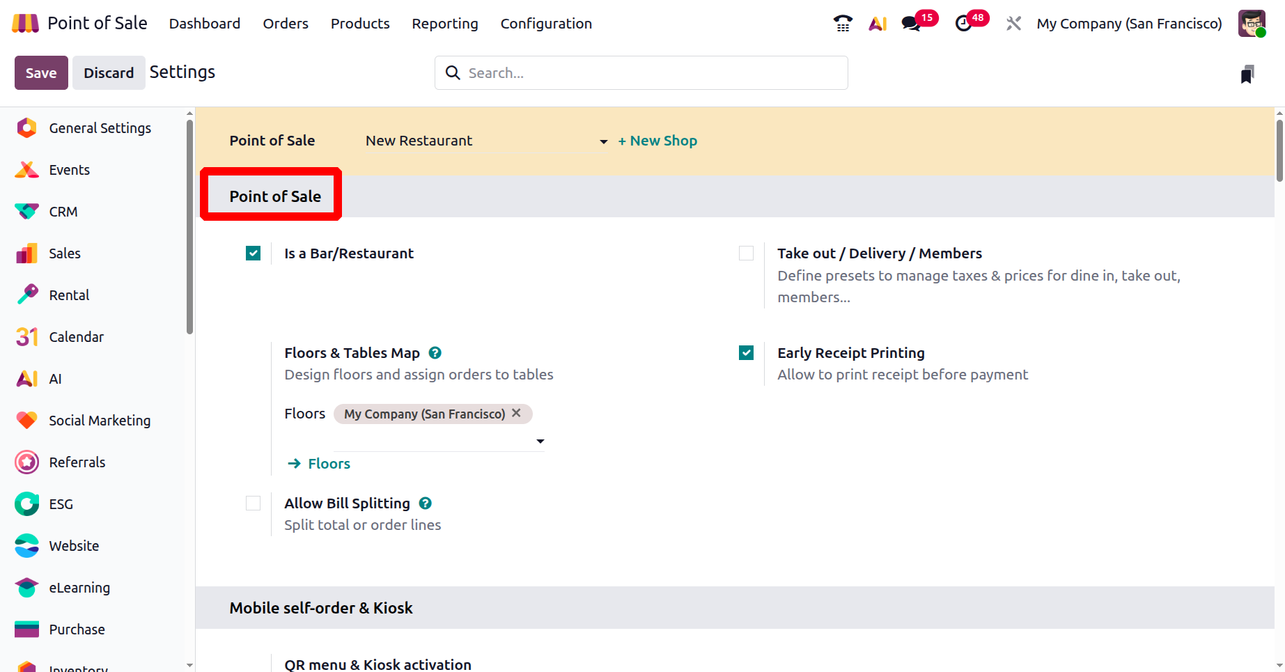 Once the restaurant name is saved, some restaurant-specific options will become visible under the settings window. Begin customizing essential restaurant features using the ‘Point of Sale’ as shown in the screenshots below.
