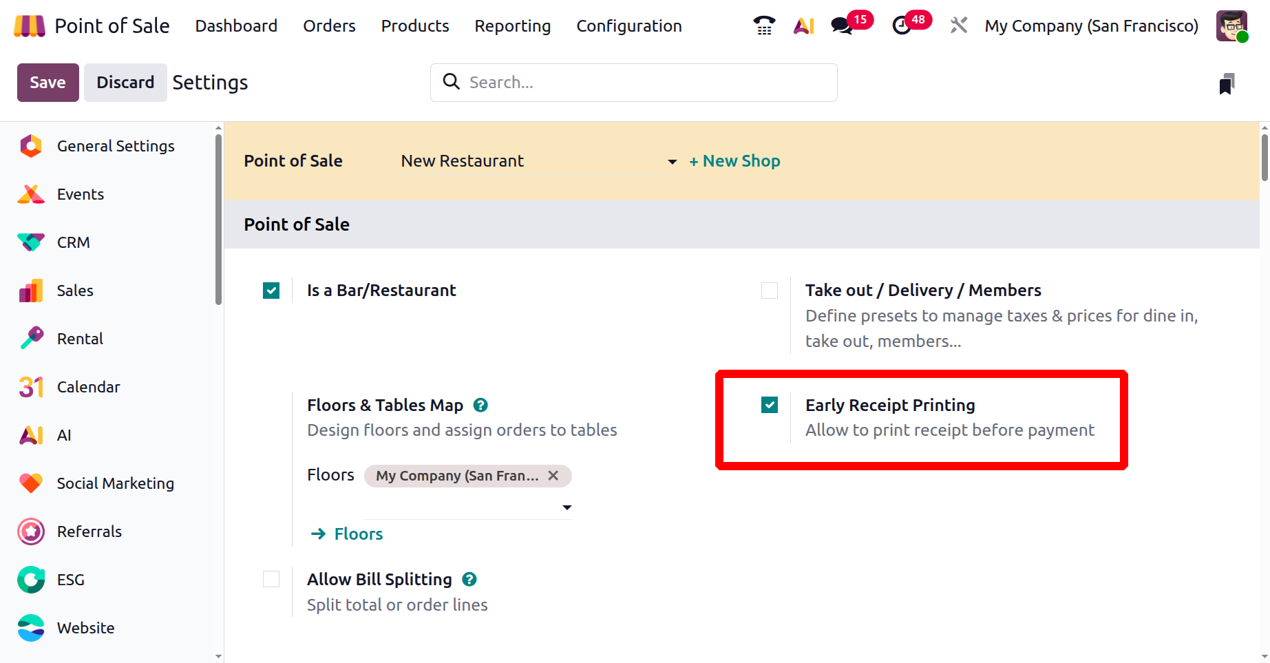 The Early Receipt Printing option in Odoo’s PoS settings window lets you print the receipt before the payment is made.