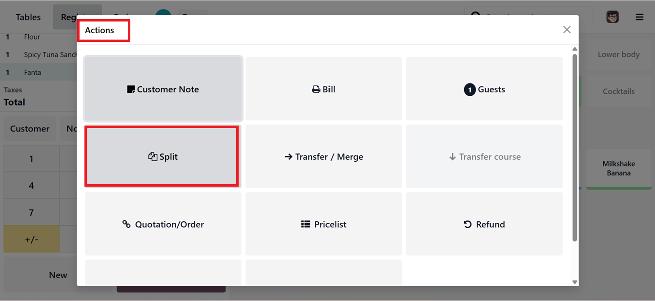 To use this feature, you can start a new restaurant session, select products, and click on the ‘Action’(Three dotted) menu. Then, choose the ‘Split’ option from the list, as depicted in the screenshot below.
