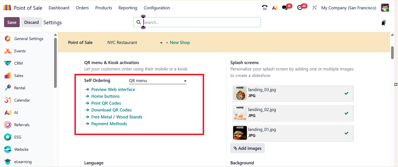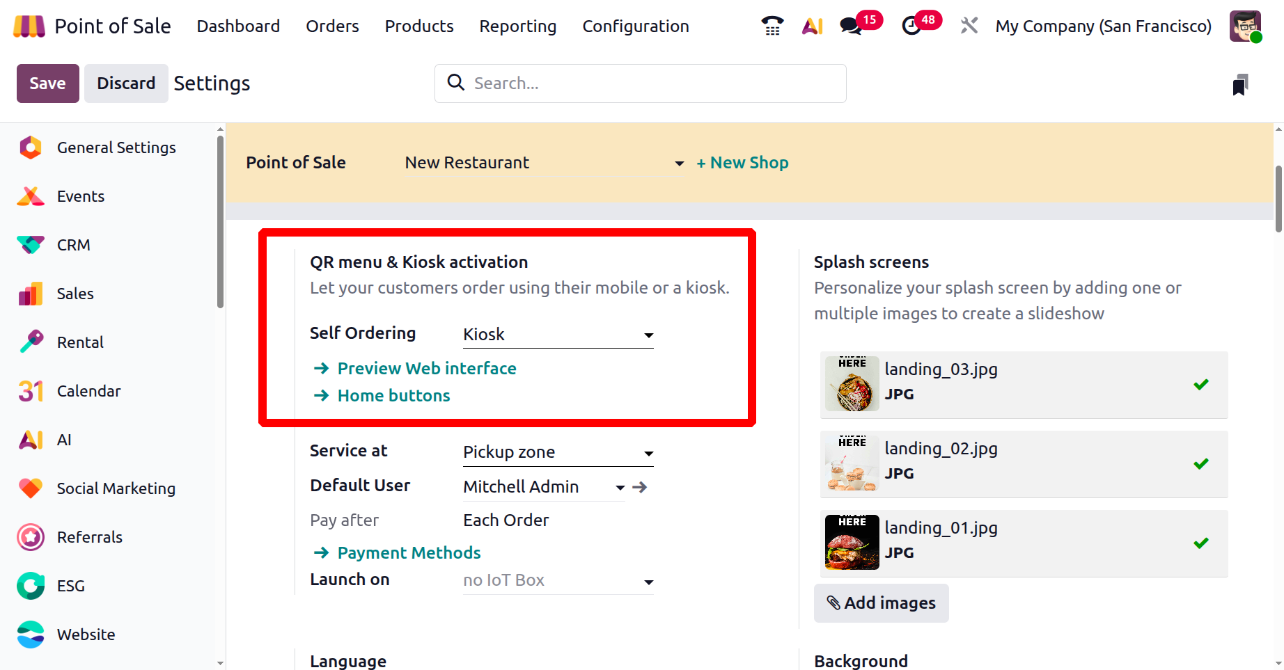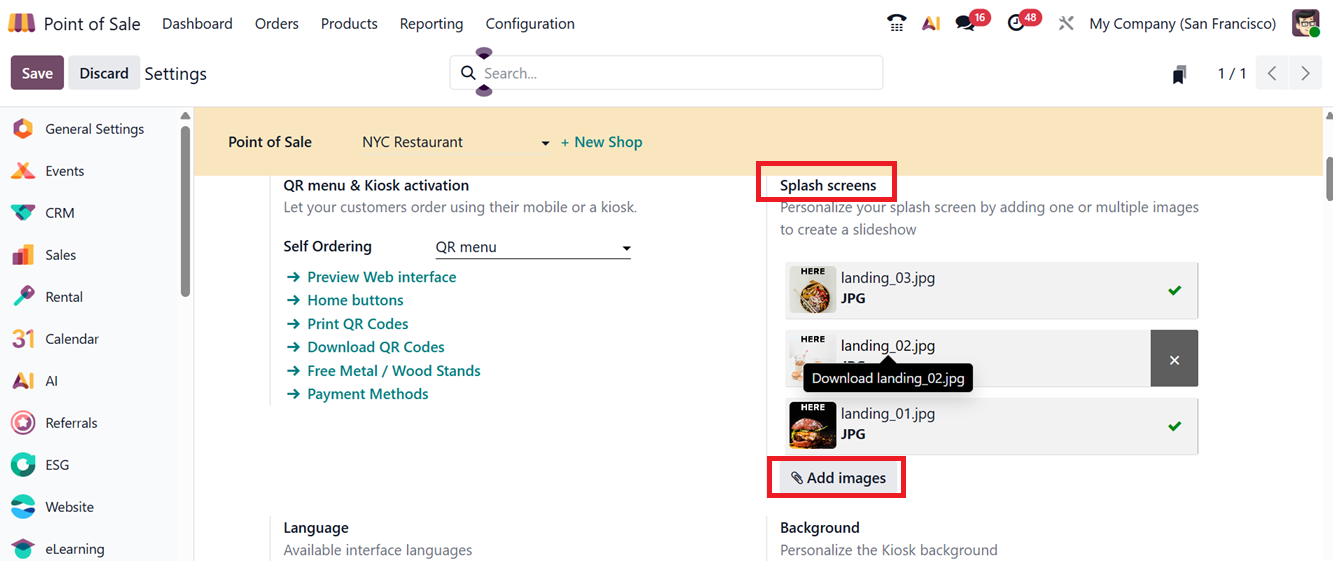In the Point of Sale (POS) module of Odoo, Splash Screens function as popup messages that deliver key information such as order overviews, promotional offers, payment notices, or customer guidance, thereby enhancing overall communication and operational flow. To personalize the interface, you can incorporate appealing splash screen visuals into the kiosk view by selecting the ‘Add images’ option located beneath the Splash Screen Images section.
